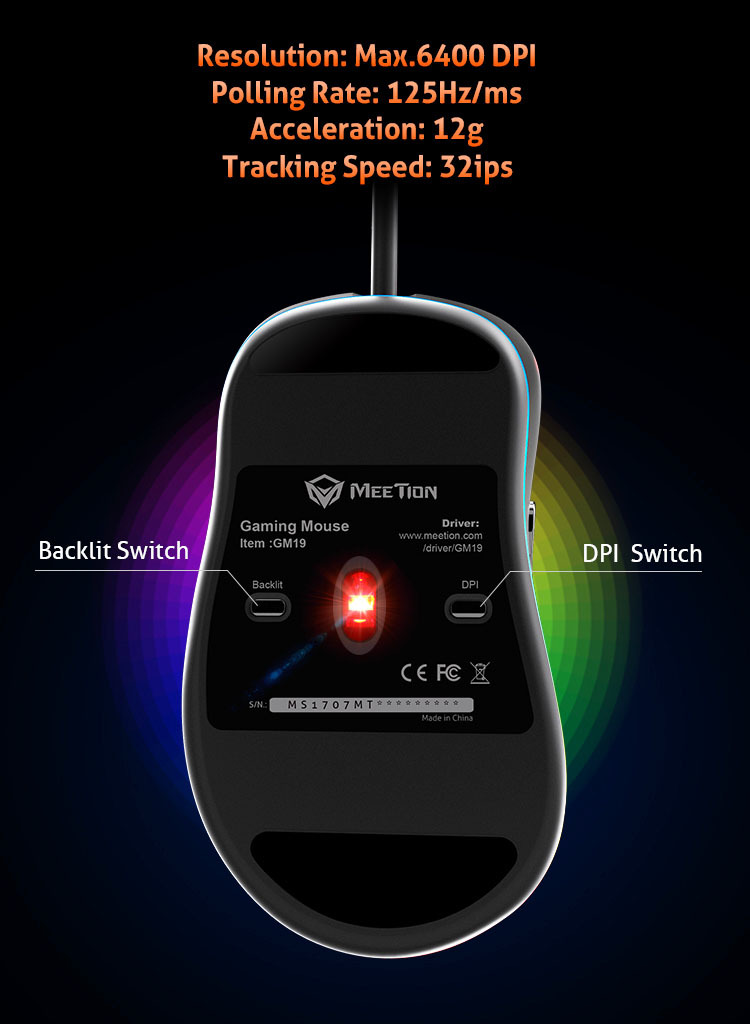 Meetion GM19 GAMING Mouse Black, RGB Backlight, 4800 DPI /6000 fps /15g /60ips /1000Hz