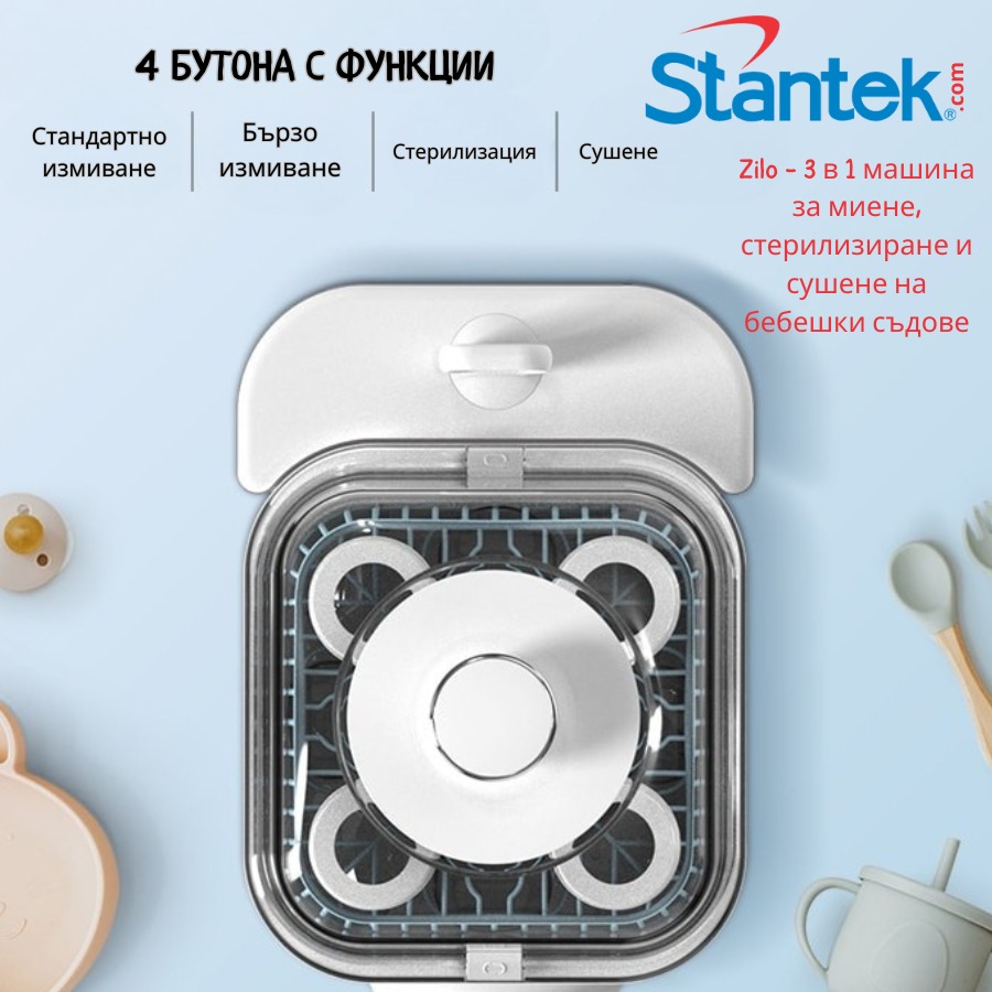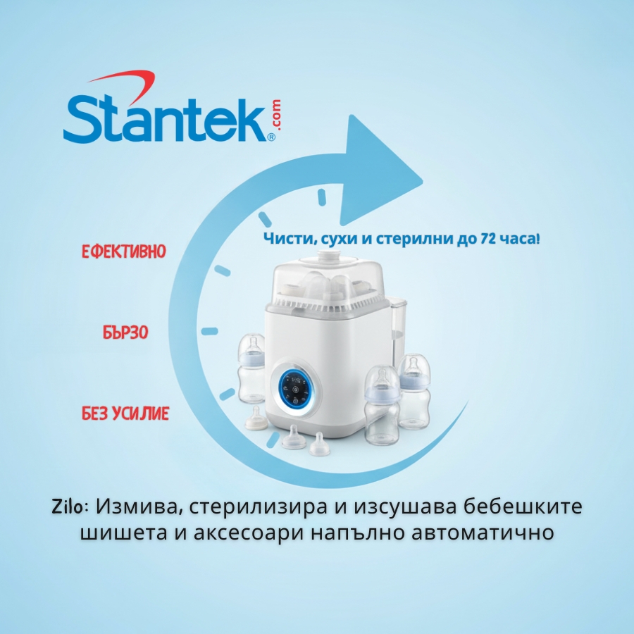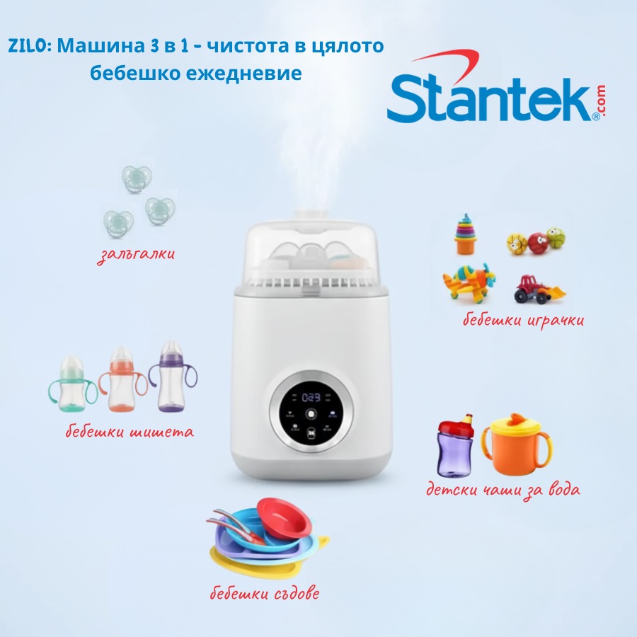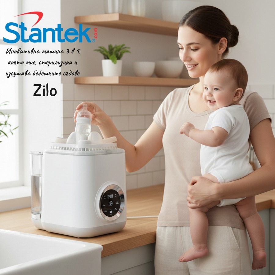 Дигиталният стерилизатор за бебешки шишета на ZILO съчетава автоматично миене, стерилизация и сушене в един уред, като осигурява хигиенна грижа за бебета.