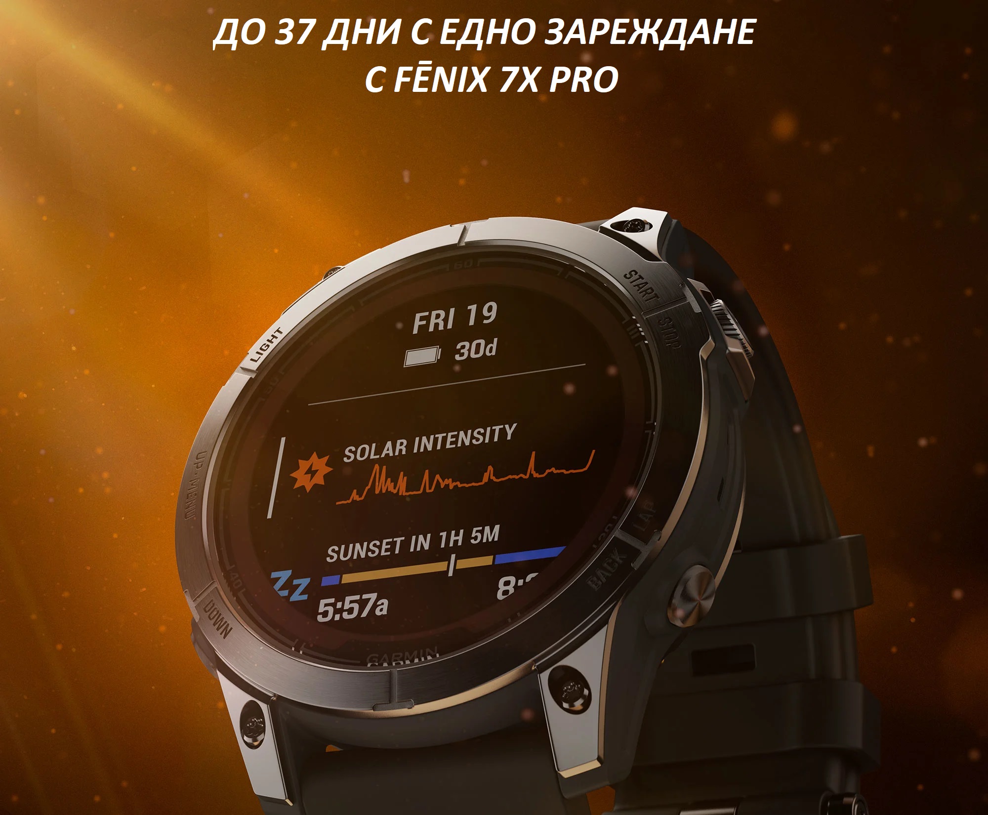 Garmin fenix 7X Pro Solar Edition, Slate Grey, 1.4"(35.56 mm) Power Sapphire дисплей, 32GB, водоустойчивост, до 37 дни време на работа, соларно зареждане, GPS, компас, Slate Grey с Black каишка, , 51 мм, черен - 010-02778-01