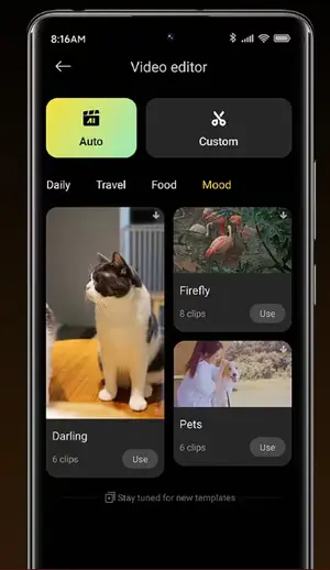 Създавайте влогове и кратки видеоклипове с помощта на AI. Изберете снимките и видеоклиповете, които искате да използвате, въведете няколко ключови описания и се отпуснете, докато потребителските шаблони и саундтраци се препоръчват интуитивно, за да вдъхнете живот на вашата визия.