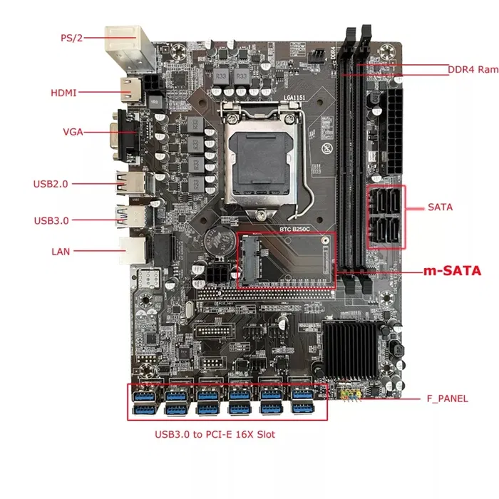 Mining Motherboard BTC B250C + 4GB RAM DDR4 2666Mhz + CPU G3900 & 12xPCI Express