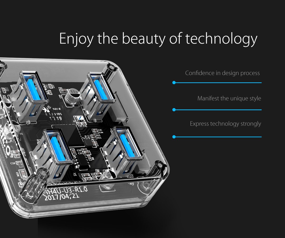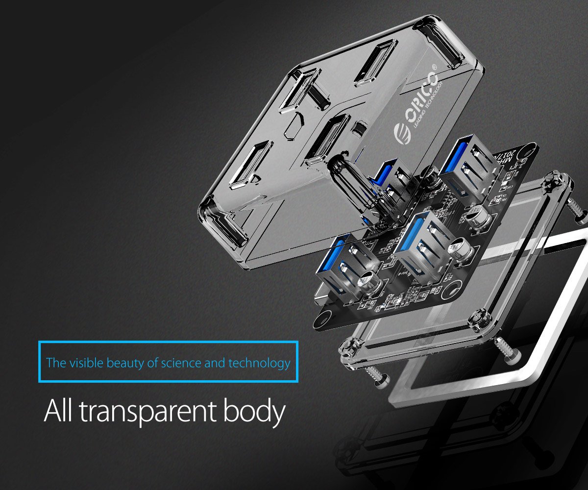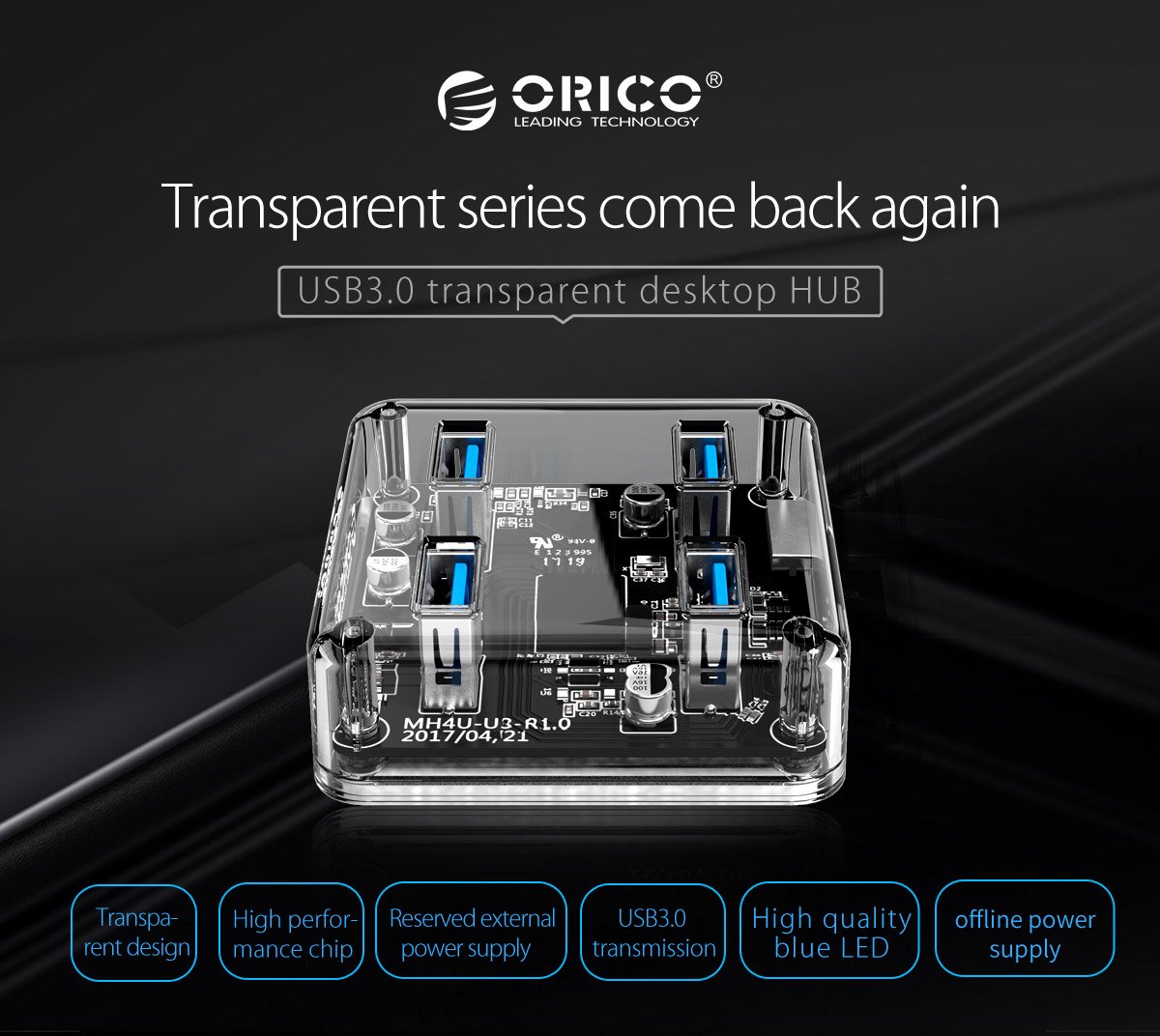 Orico Orico хъб USB3.0 HUB 4 port transparent, 1m cable - MH4U-U3-10-CR
