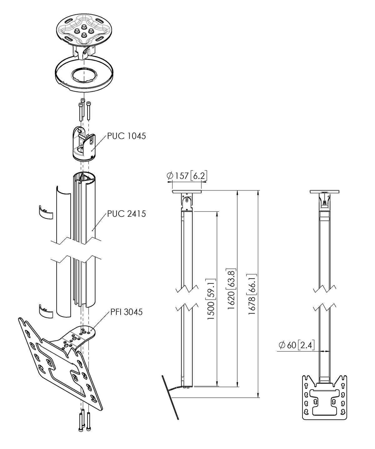 Стойка за плосък таван за екрани до 65", до 80 кг, VESA 400x400, тръба 150 см, сребро - C1544S
