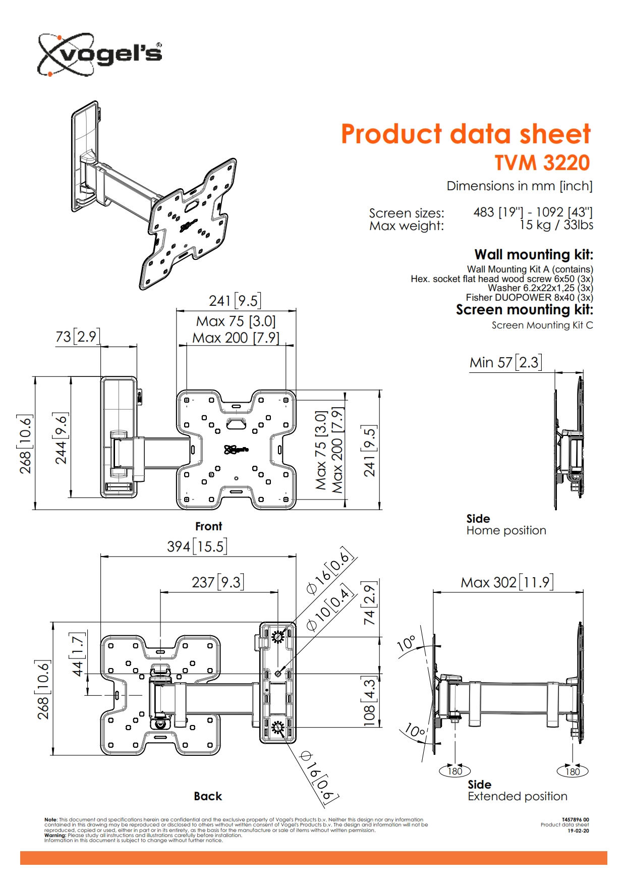 Vogel's MA2010 Стойка за стена за LED/LCD с размер 19"- 43" с наклон 15° - MA2010