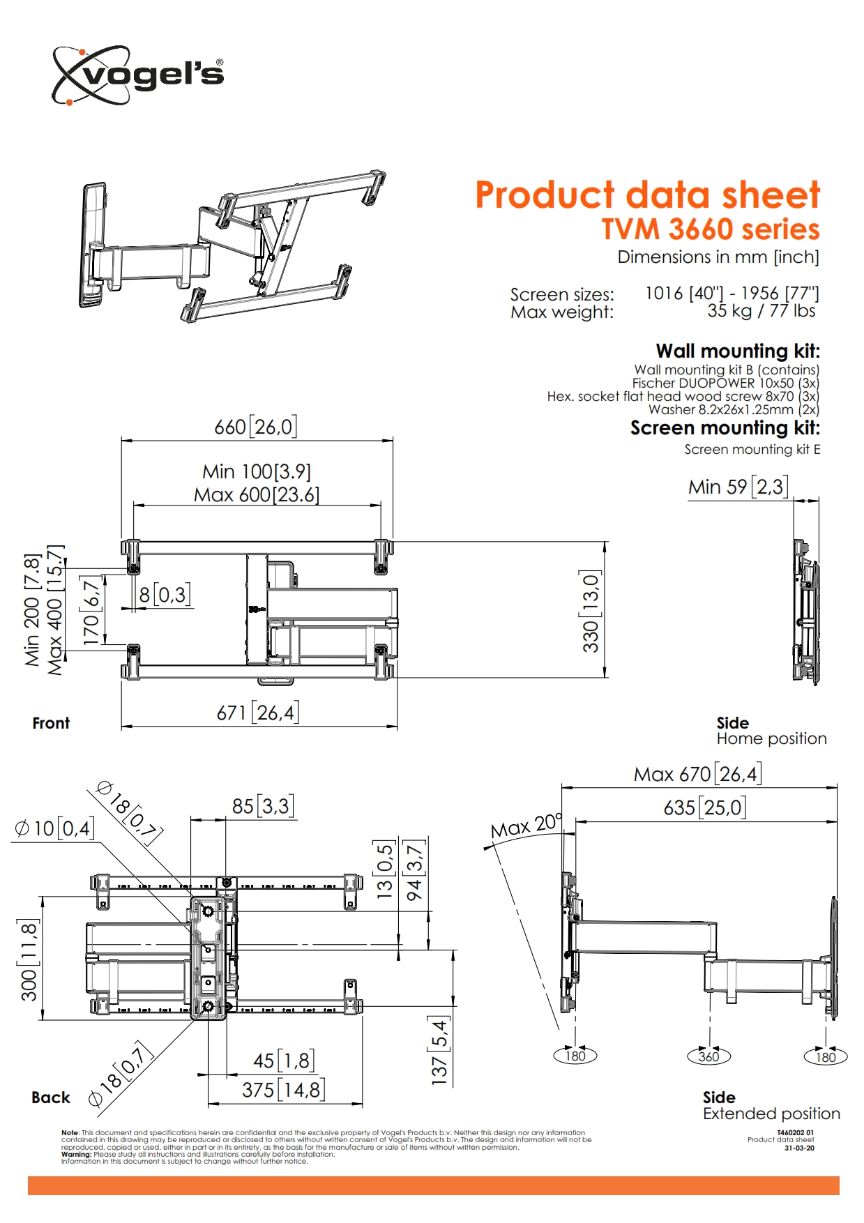 Vogel's MA2040 Стойка за стена за LED/LCD с размер 19"- 40" с две рамена и наклон 15° - MA2040