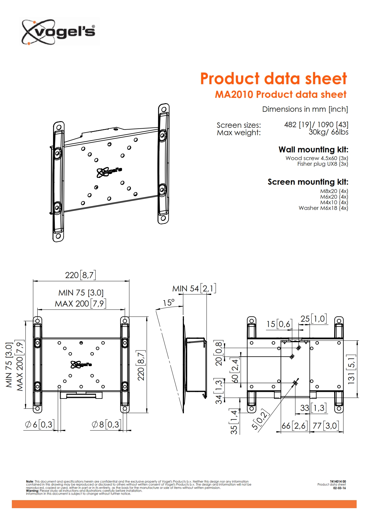 Vogel's MA2010 Стойка за стена за LED/LCD с размер 19"- 43" с наклон 15° - MA2010