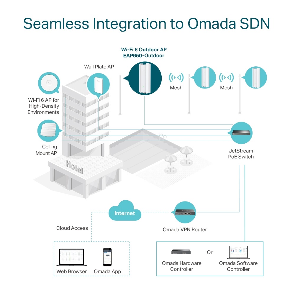 Безпроблемна интеграция в платформата Omada SDN Платформата Omada Software Defined Networking (SDN) интегрира мрежови устройства, включително точки за достъп, комутатори и рутери, за да осигури 100% централизирано управление на облака и да създаде силно мащабируема мрежа - всичко това се контролира от един интерфейс.