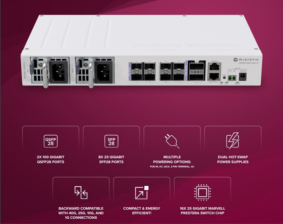 Комутатор MikroTik CRS510-8XS-2XQ-IN 2x 100 Gigabit QSFP28 порта, 8x 25 Gigabit SFP28 порта (v)
