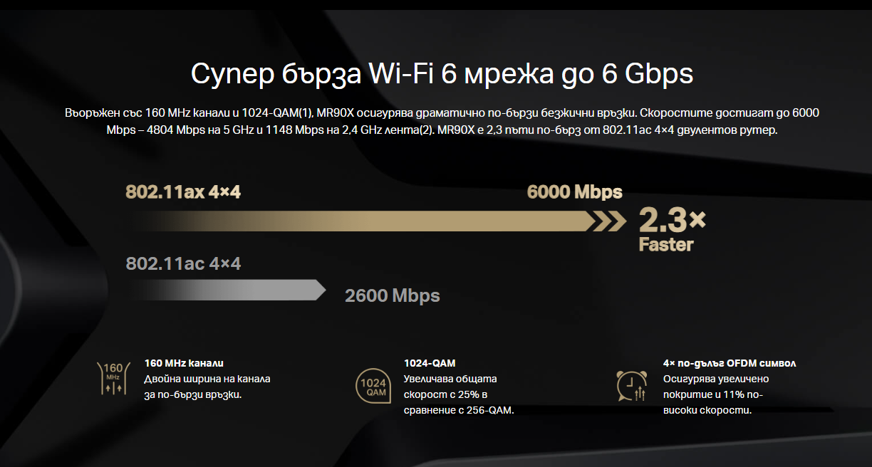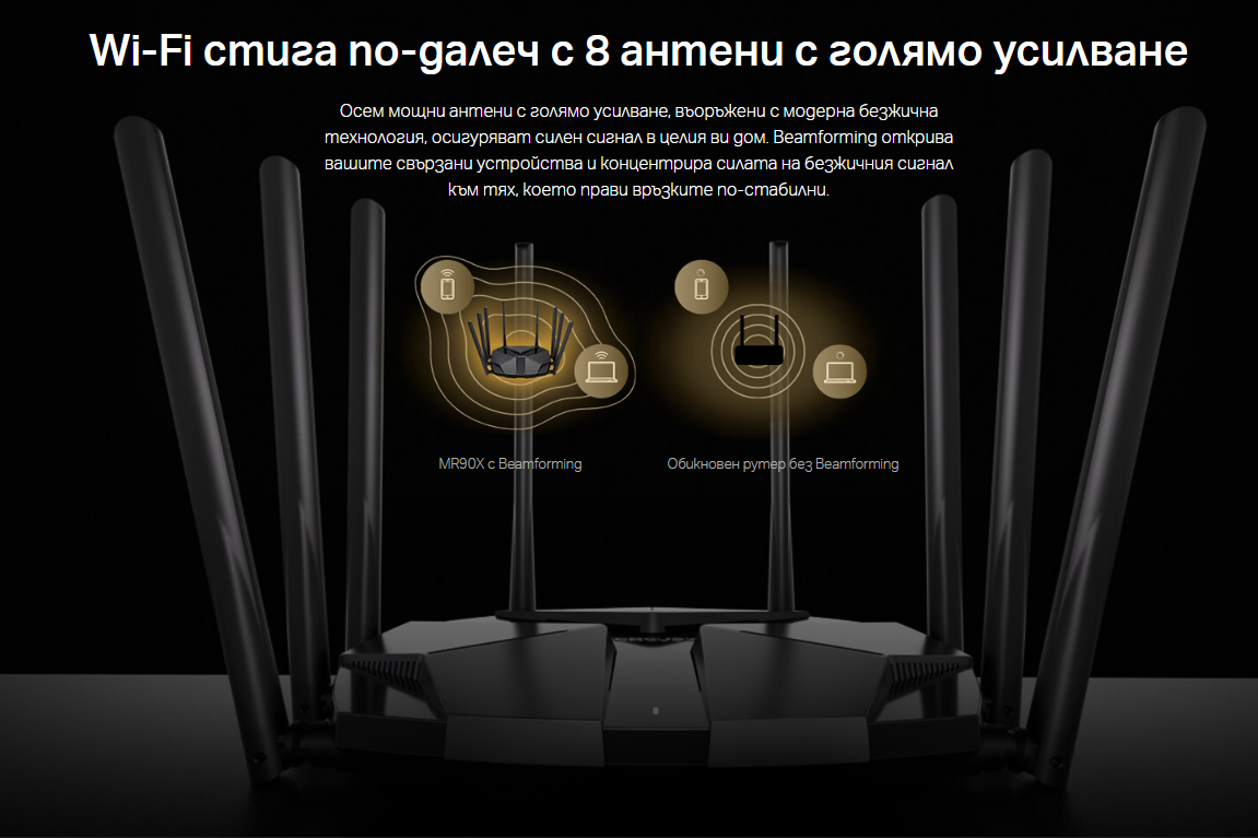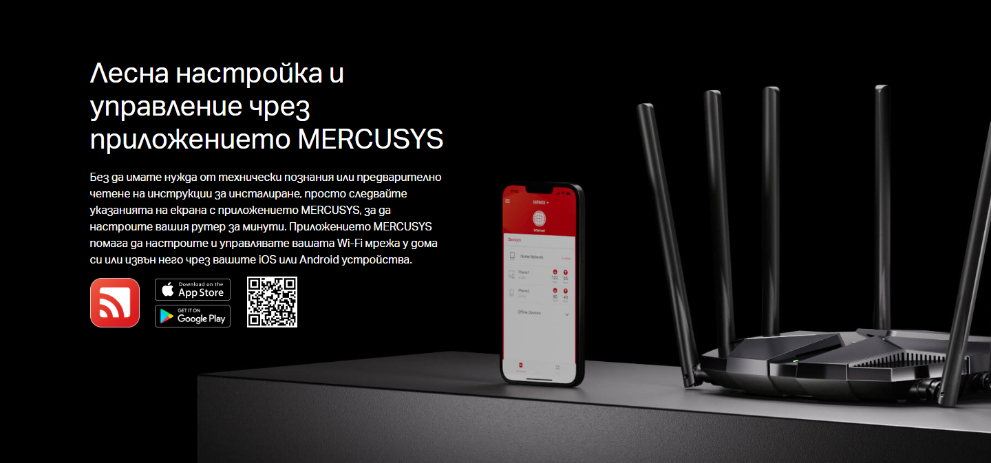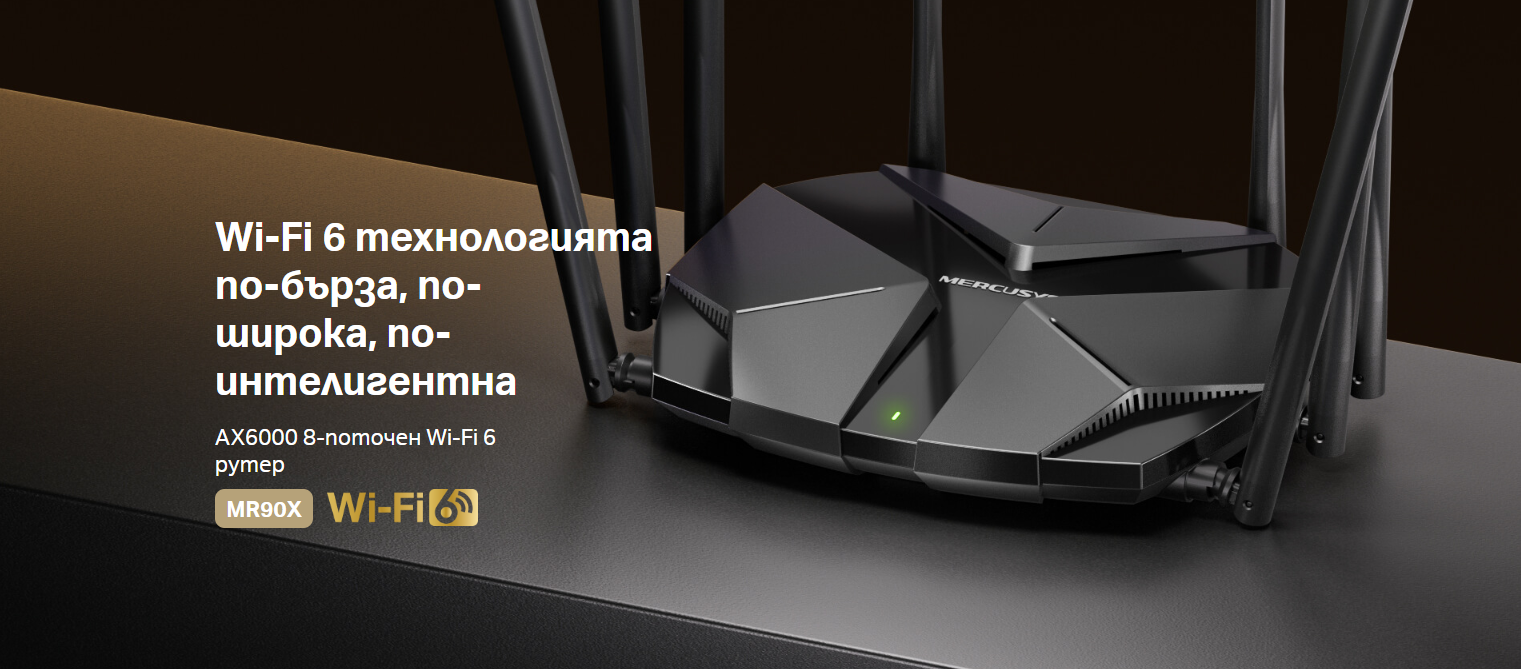 Mercusys MR60X, 1500Mbps, 2.4GHz (300 Mbps)/5GHz (1201 Mbps), Wireless AX, 2x 10/100/1000Mbps LAN, 1x 10/100/1000Mbps WAN, 4x външни антени