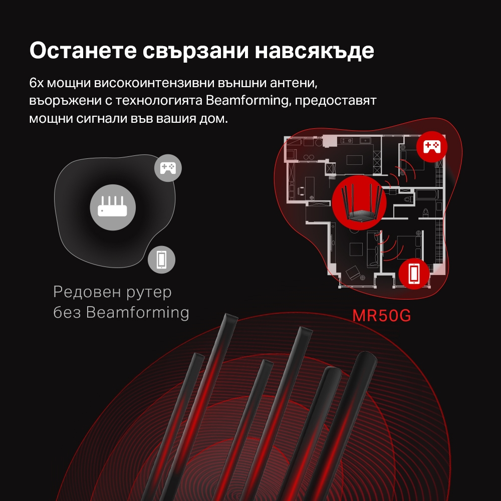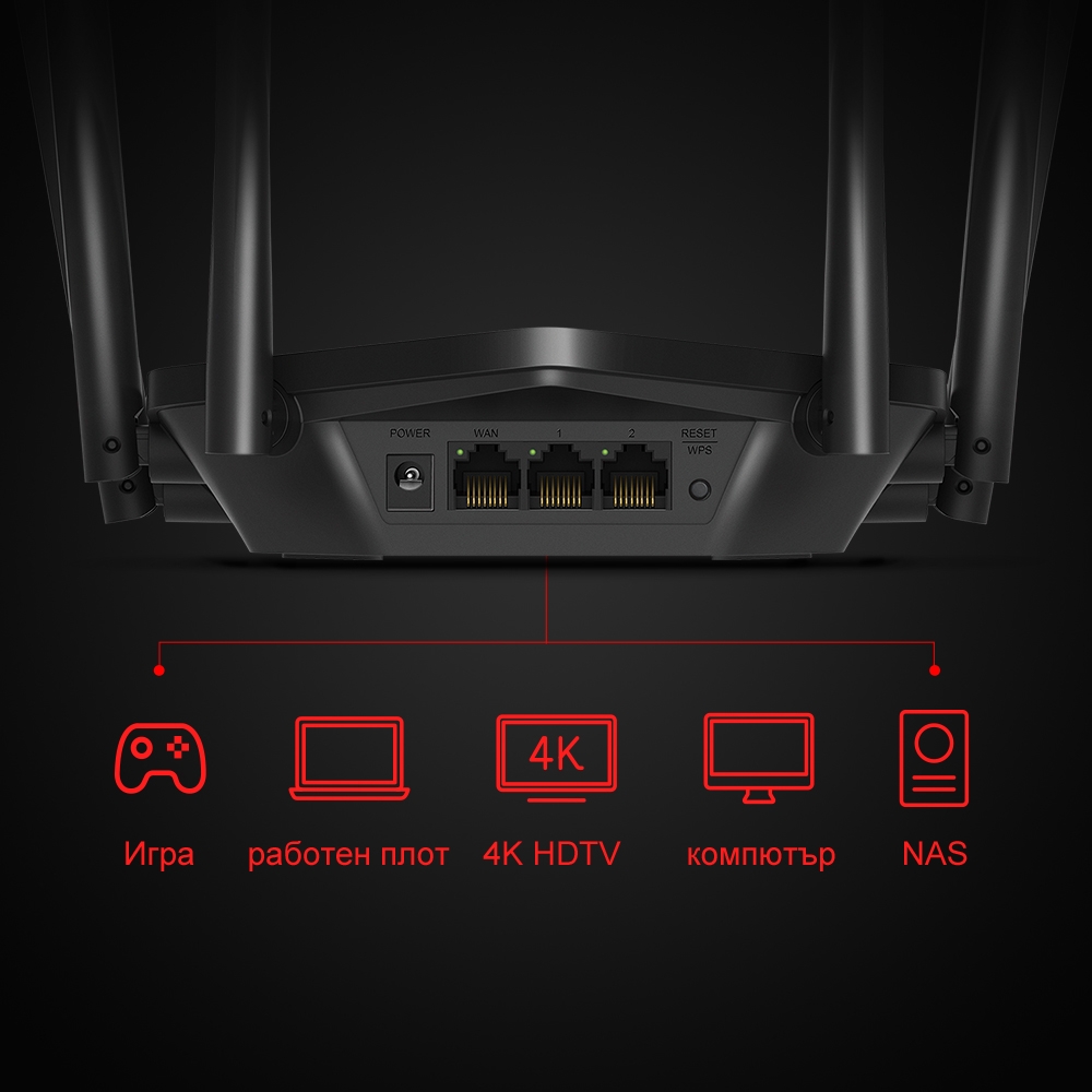 Mercusys MR60X, 1500Mbps, 2.4GHz (300 Mbps)/5GHz (1201 Mbps), Wireless AX, 2x 10/100/1000Mbps LAN, 1x 10/100/1000Mbps WAN, 4x външни антени