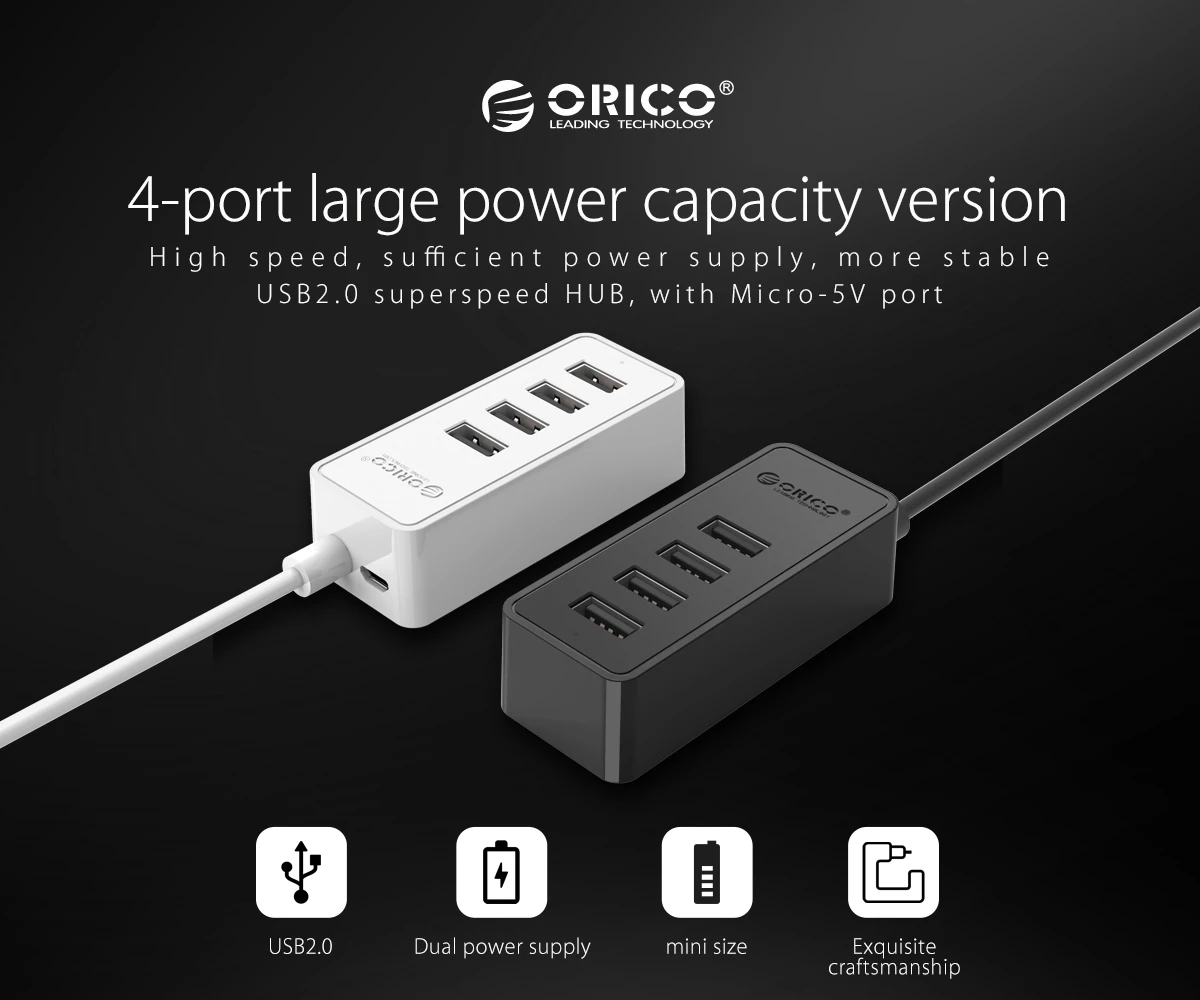 Orico Orico хъб USB2.0 HUB 4 port USB/Micro USB input, Black W5P-U2-030-BK-EP - W5P-U2-030-BK-EP-HW