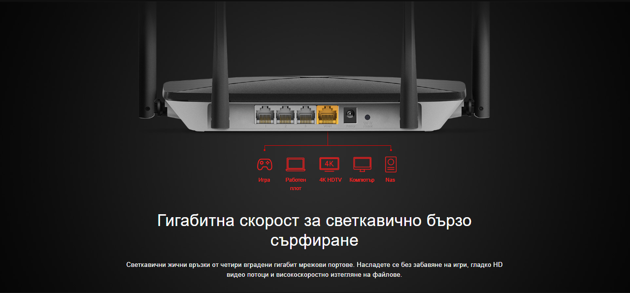 Mercusys MR60X, 1500Mbps, 2.4GHz (300 Mbps)/5GHz (1201 Mbps), Wireless AX, 2x 10/100/1000Mbps LAN, 1x 10/100/1000Mbps WAN, 4x външни антени