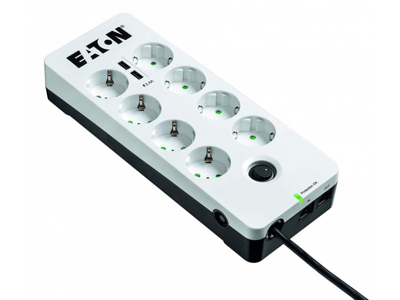 Разклонител Eaton Protection Box 6 USB DIN, 6 гнезда, защита от пренапрежение, 2x USB, 1.5m, бял/черен, PB6TUD