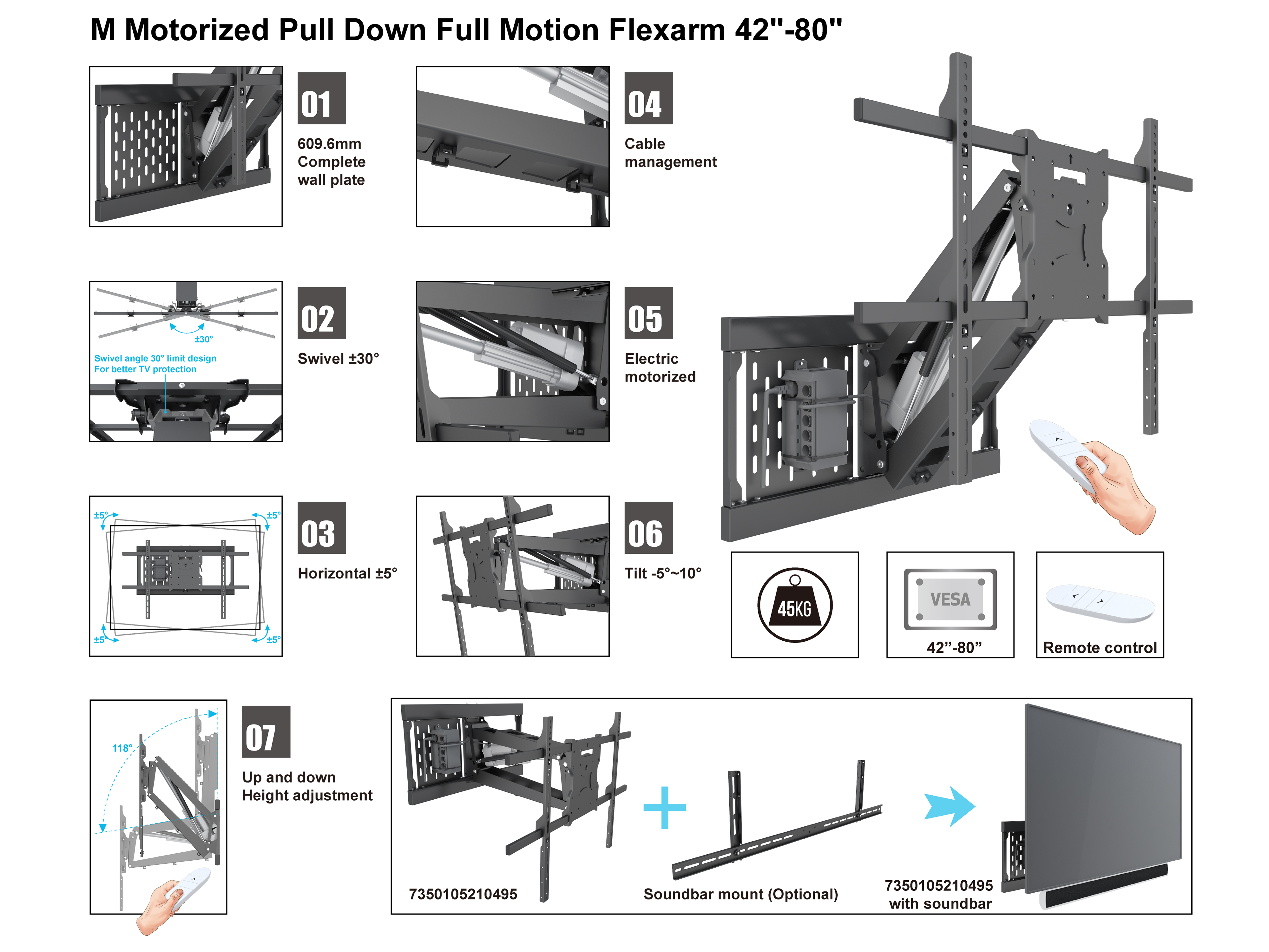 MB0495 Електрическа стойка за TV 42"-80"с вертикален ход 63см - MB0495
