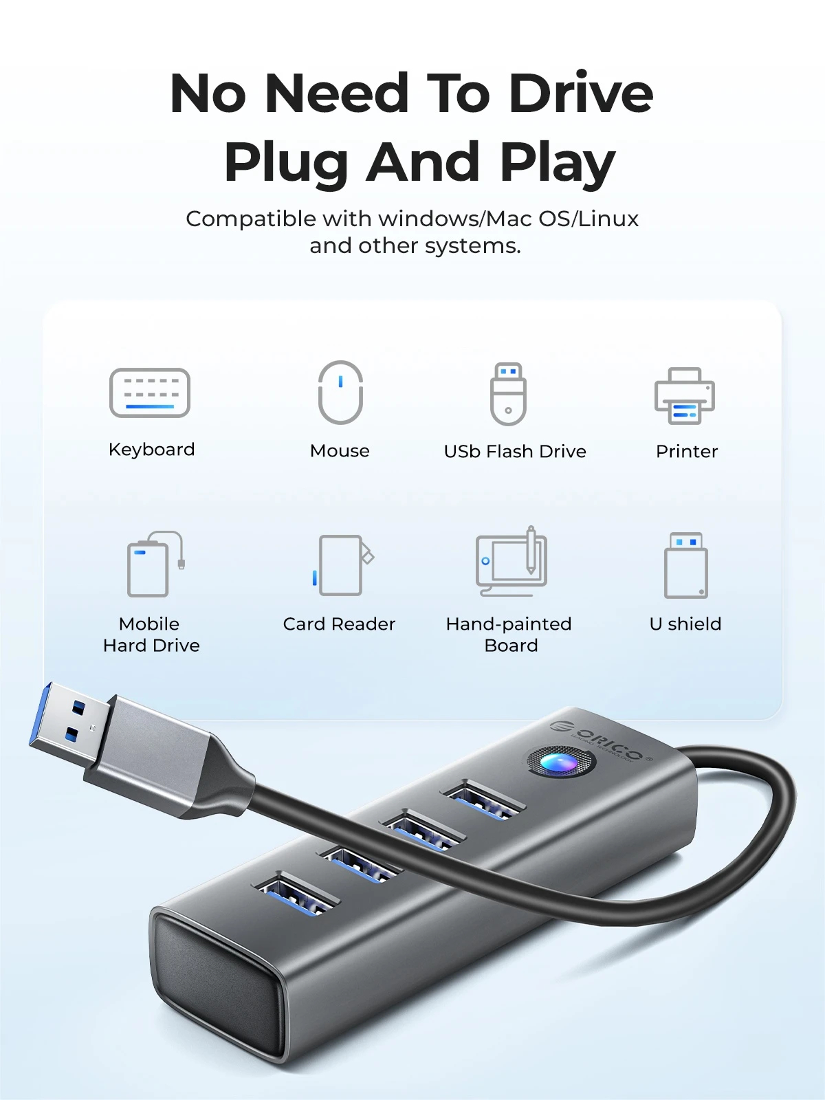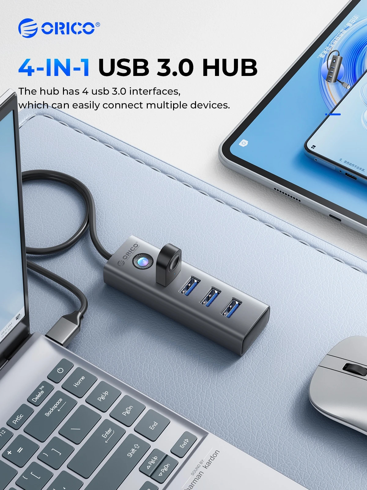 Orico Orico хъб USB3.0/2.0 HUB 4 port, Aluminum AH-A13-GY - AH-A13-GY-BP