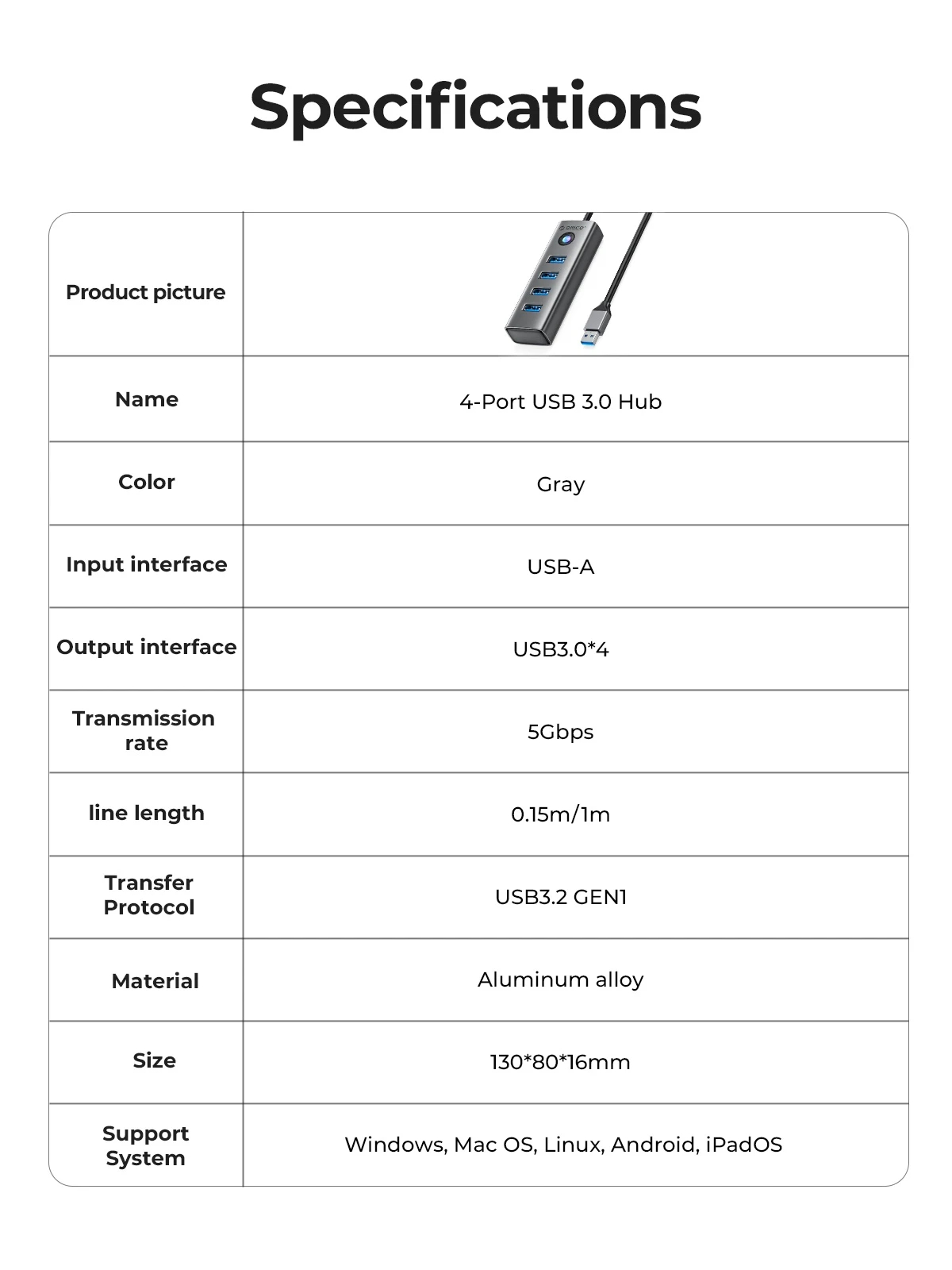 Orico Orico хъб HUB USB3.0 4 port, Aluminium, Grey PDD4U-U3-015-GY - PDD4U-U3-015-GY-EP
