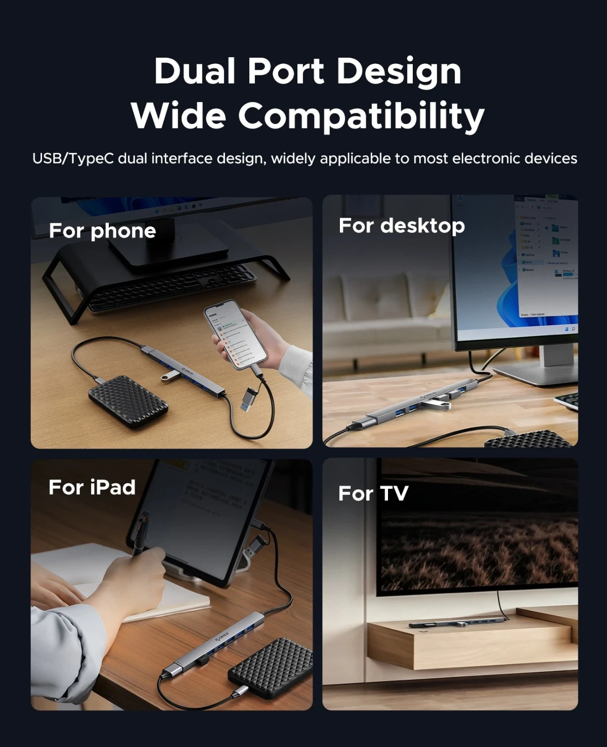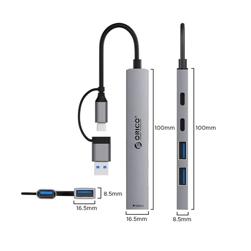 Orico Orico хъб HUB USB-C 5 port USB3.0 x 1, USB2.0 x 2, USB-C x 2, Aluminium YSA4-U2-GY - YSA4-U2-GY-BP