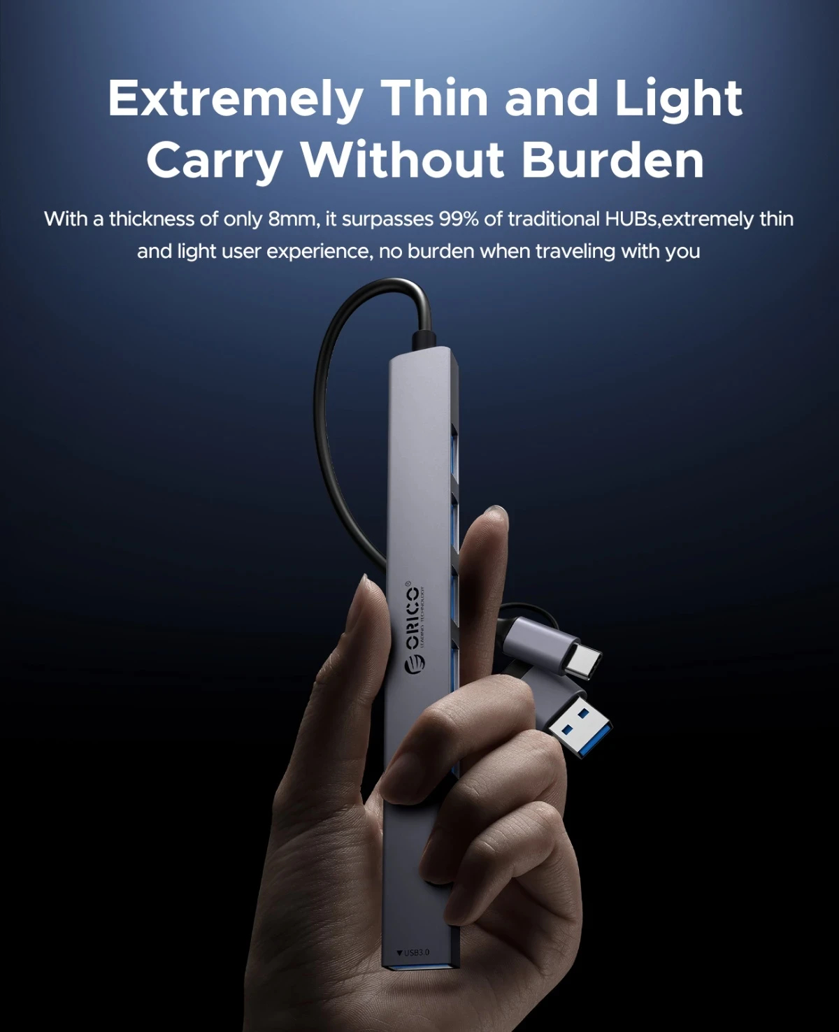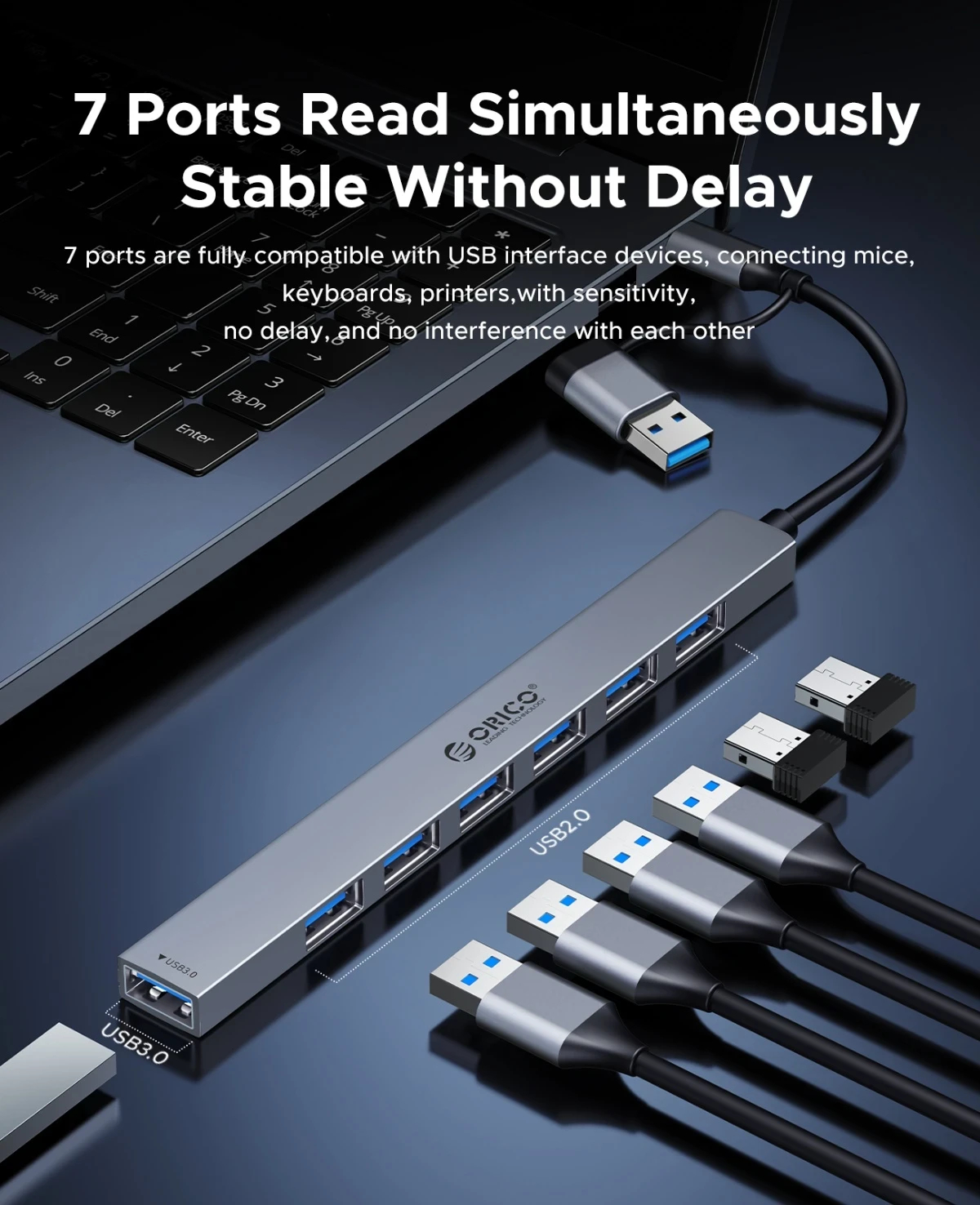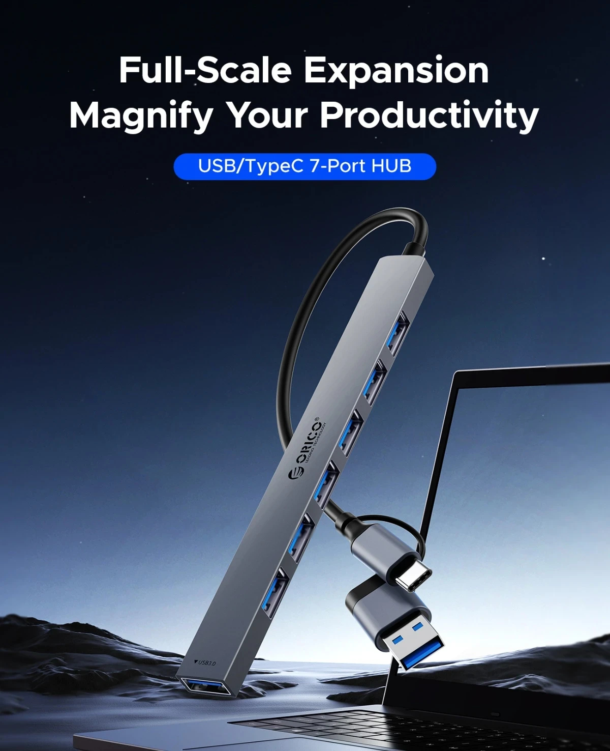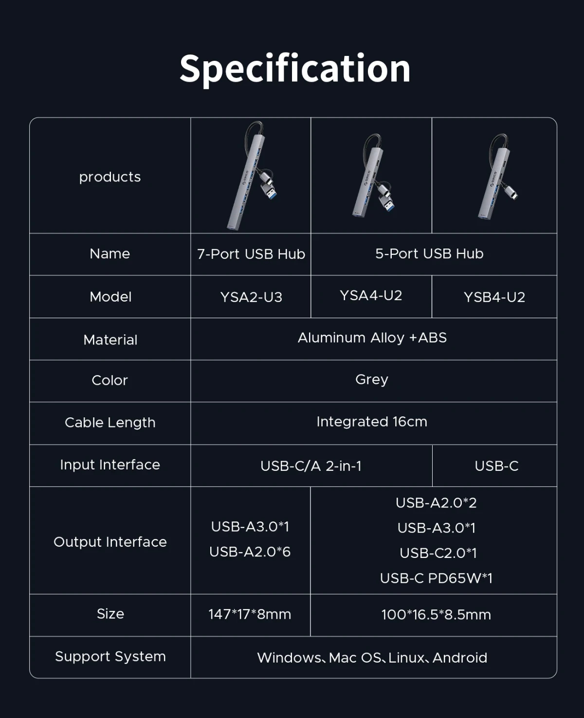 Orico Orico хъб HUB USB-C/USB-A 7 port USB-C x 2, USB3.0 x 1, USB2.0 x 4, Aluminium YSA7-U3-GY - YSA7-U3-GY-BP
