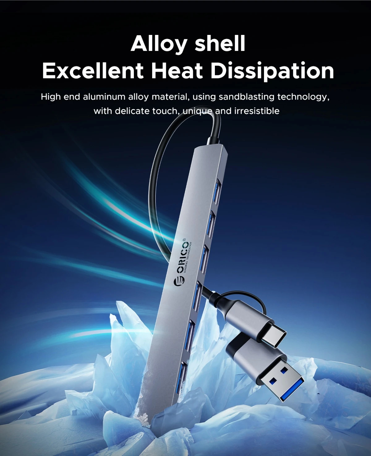 Orico Orico хъб HUB USB-C/USB-A 7 port USB-C x 2, USB3.0 x 1, USB2.0 x 4, Aluminium YSA7-U3-GY - YSA7-U3-GY-BP