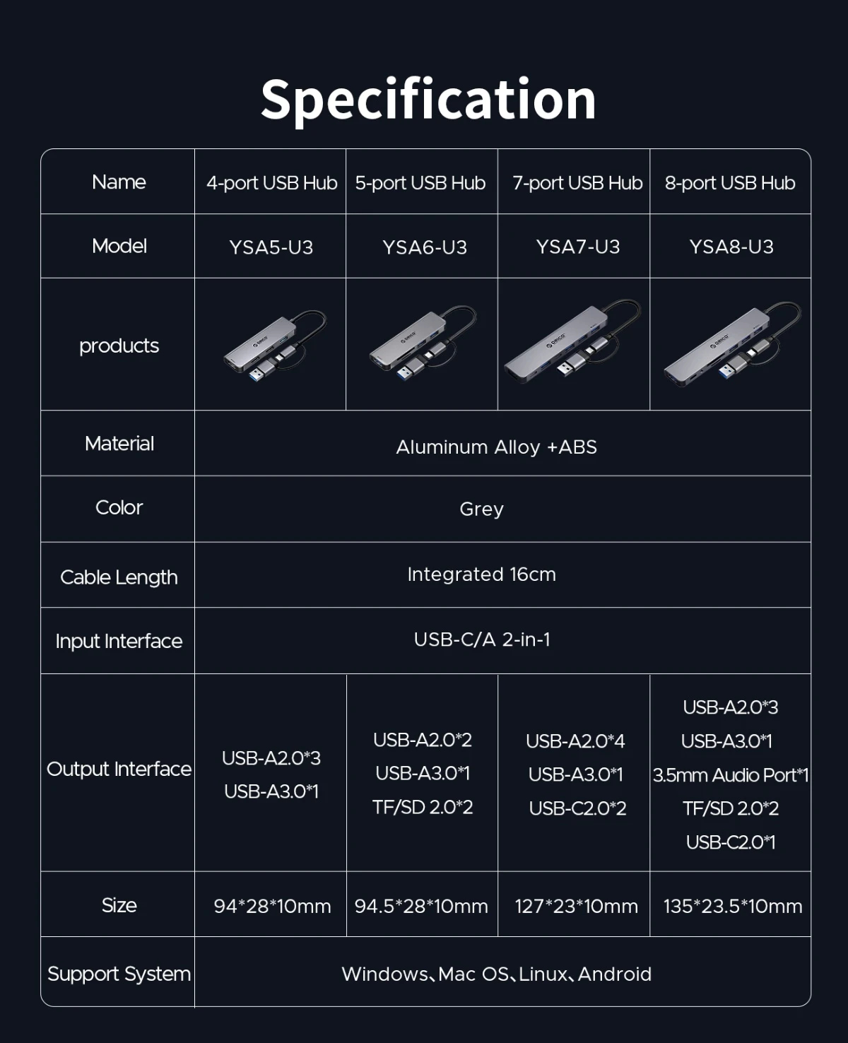 Orico Orico хъб HUB USB-C/USB-A 7 port USB-C x 2, USB3.0 x 1, USB2.0 x 4, Aluminium YSA7-U3-GY - YSA7-U3-GY-BP