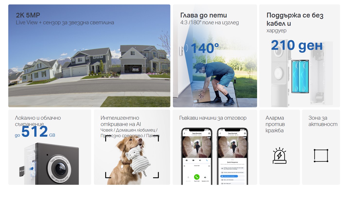 210-дневна батерия или с кабел: 10000 mAh батерия или 8-24 V твърда връзка, поддържа предварително пускане, когато е свързан с твърда връзка. 2K 5MP яснота: Осигурява по-фини детайли и невероятна яснота. 180 градуса ултраширок изглед: Улавя всичко от главата до петите. Пълноцветно нощно виждане с прожектор: Ярка нощна видимост и сигурност. Безплатно откриване и известяване: Сигнали за човек, превозно средство, домашен любимец и пакет. Двупосочно аудио: Висококачествен разговор с първокласен микрофон и високоговорители. Бърза реакция: Бърза реакция във всяка ситуация. IP66 Устойчив на атмосферни влияния: надежден при всякакви метеорологични условия. Локално и облачно съхранение: Поддържа microSD карта (до 512GB) и облачни услуги Tapo Care.