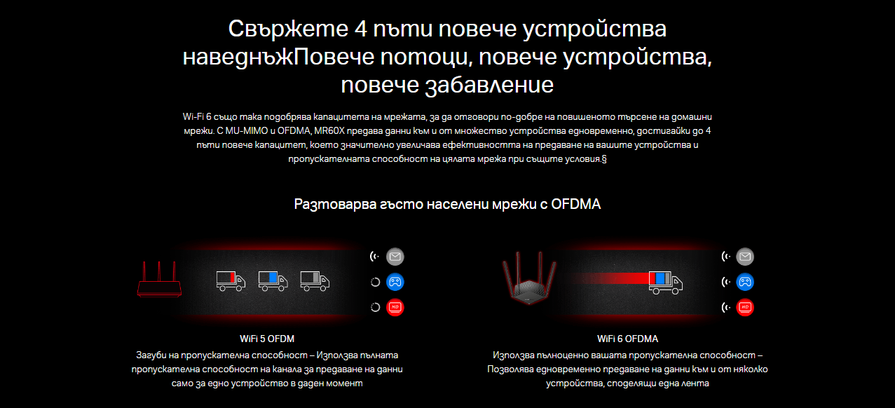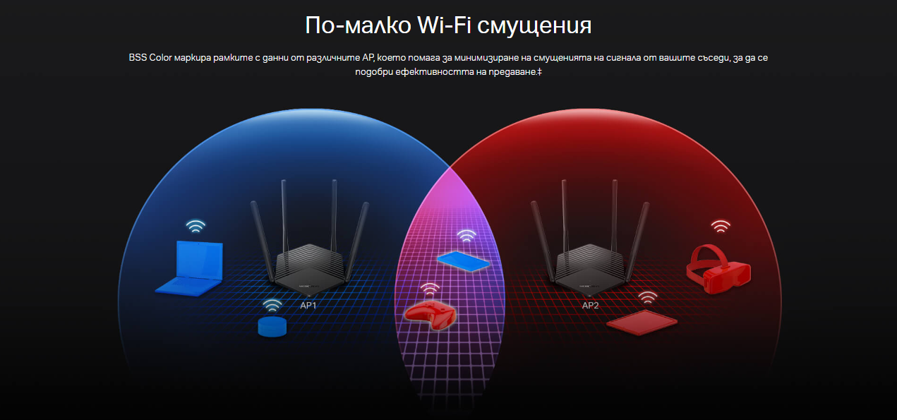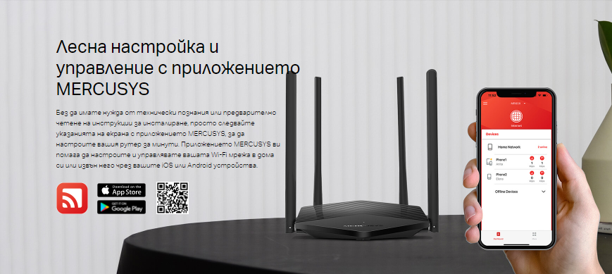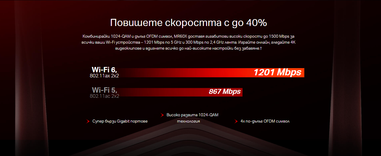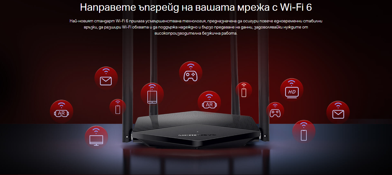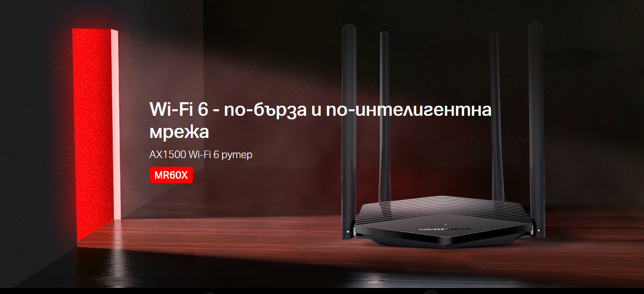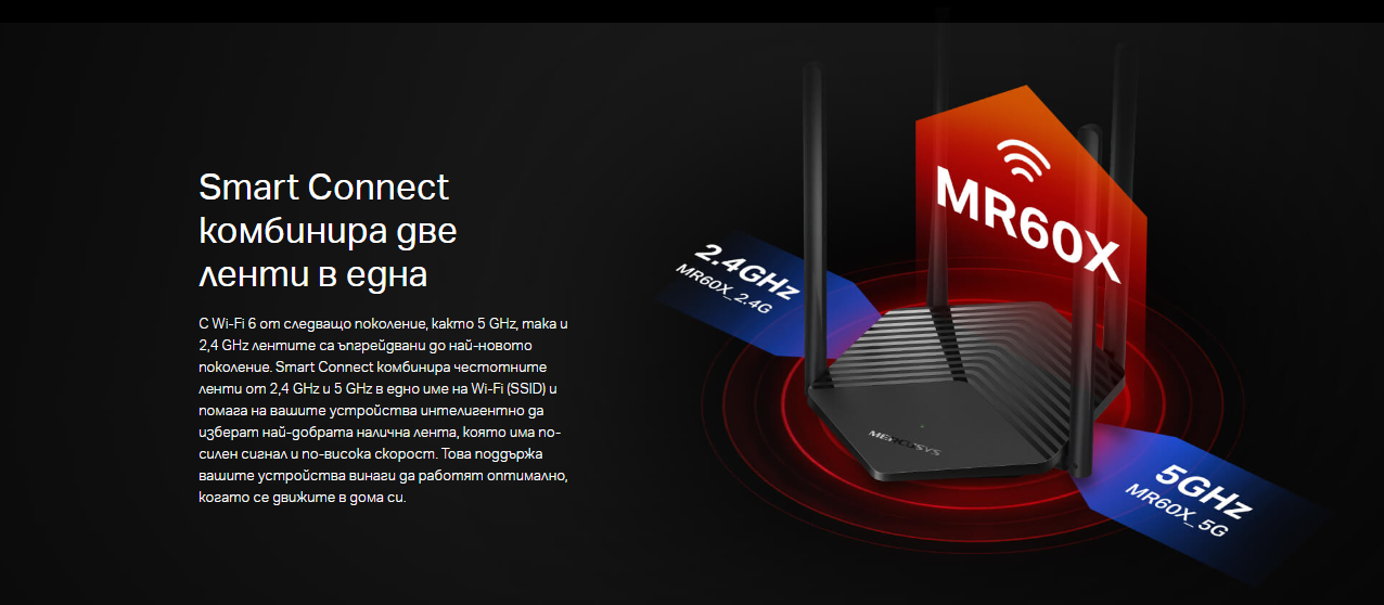 Mercusys MR60X, 1500Mbps, 2.4GHz (300 Mbps)/5GHz (1201 Mbps), Wireless AX, 2x 10/100/1000Mbps LAN, 1x 10/100/1000Mbps WAN, 4x външни антени