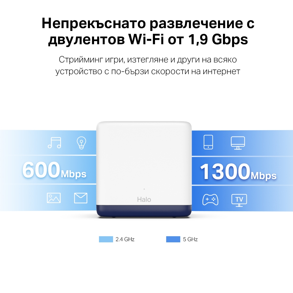 Безжична Wi-Fi 6 Mesh система Mercusys, 1800Mbps, 2.4GHz (1201Mbps)/ 5GHz (574Mbps), Wireless AX, 3x LAN/WAN 10/100/1000Mbps, Halo H70X(3-pack) AX1800