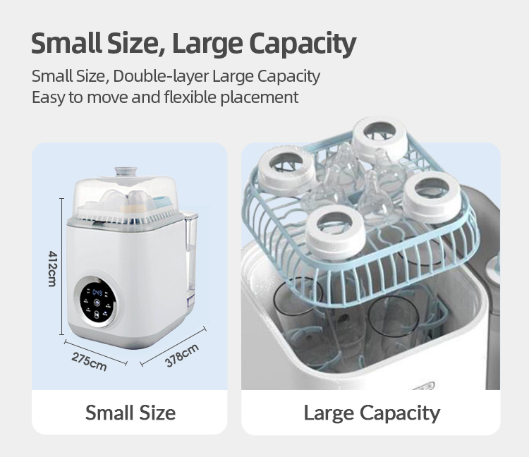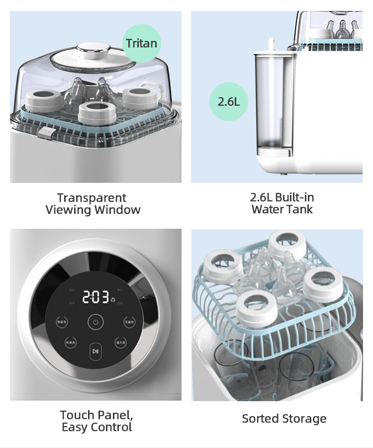 Идеален за всеки дом, уредът предлага спестяващо време решение „всичко в едно“ за поддържане на шишетата и аксесоарите за хранене стерилни.
