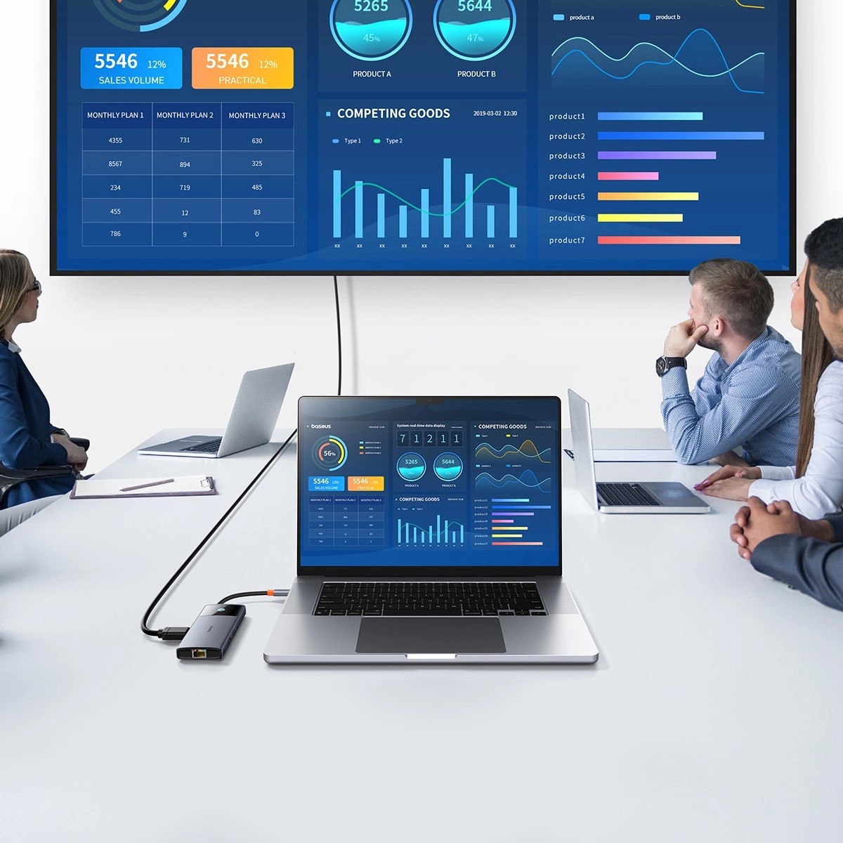USB хъб Baseus Type-C 9 в 1 с USB Type-C PD/3x USB 3.2 Gen 1/RJ45 1 Gbps/VGA FHD 60 Hz/HDMI 4k 30 Hz/TF/SD (v)