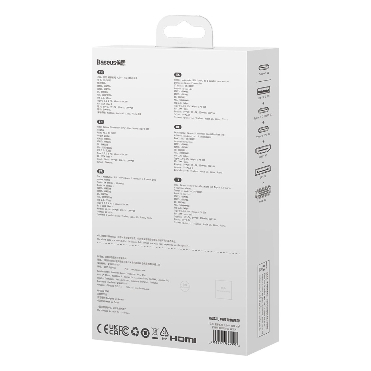 Докинг станция Baseus PioneerJoy 8-в-1 USB-C хъб - HDMI 4K@60Hz + HDMI 4K@30Hz + DisplayPort 8K@30Hz + VGA + 2x USB-A 3.0 + 2x USB-C - WKYY030413 - сив (v)