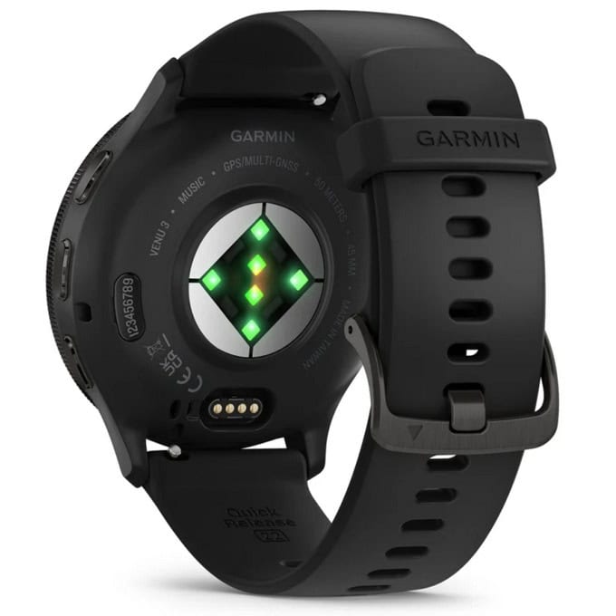 Garmin Venu 3 (Slate/Black), 1.4" (3.54cm) AMOLED дисплей, 45 мм, Bluetooth, ANT+, Wi-Fi, GPS, пулсомер, проследяване на стреса, мониторинг на съня, профили за бягане и плуване, 5ATM, до 14 дни живот на батерията, черен, 010-02784-01