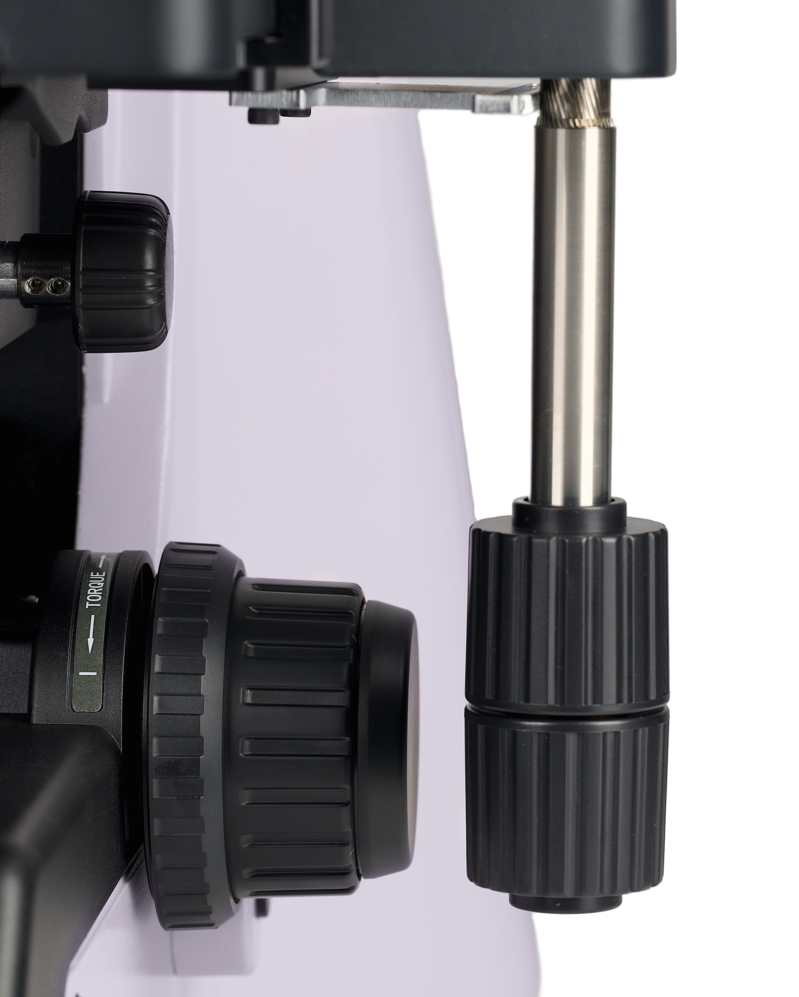 Бутоните за грубо и фино фокусиране са коаксиални и разположени ниско. Изследователят може да постави ръцете си върху масата и да заеме комфортна поза пред микроскопа. Бутонът за застопоряване при грубо фокусиране Ви предоставя възможност за бързо регулиране на микроскопа след смяна на обекта на изследването. Бутонът се намира от лявата страна на микроскопа на оста на механизма за фокусиране. Пръстенът от дясната страна регулира усилието при грубото фокусиране. Потребителят настройва удобното за работа усилие.