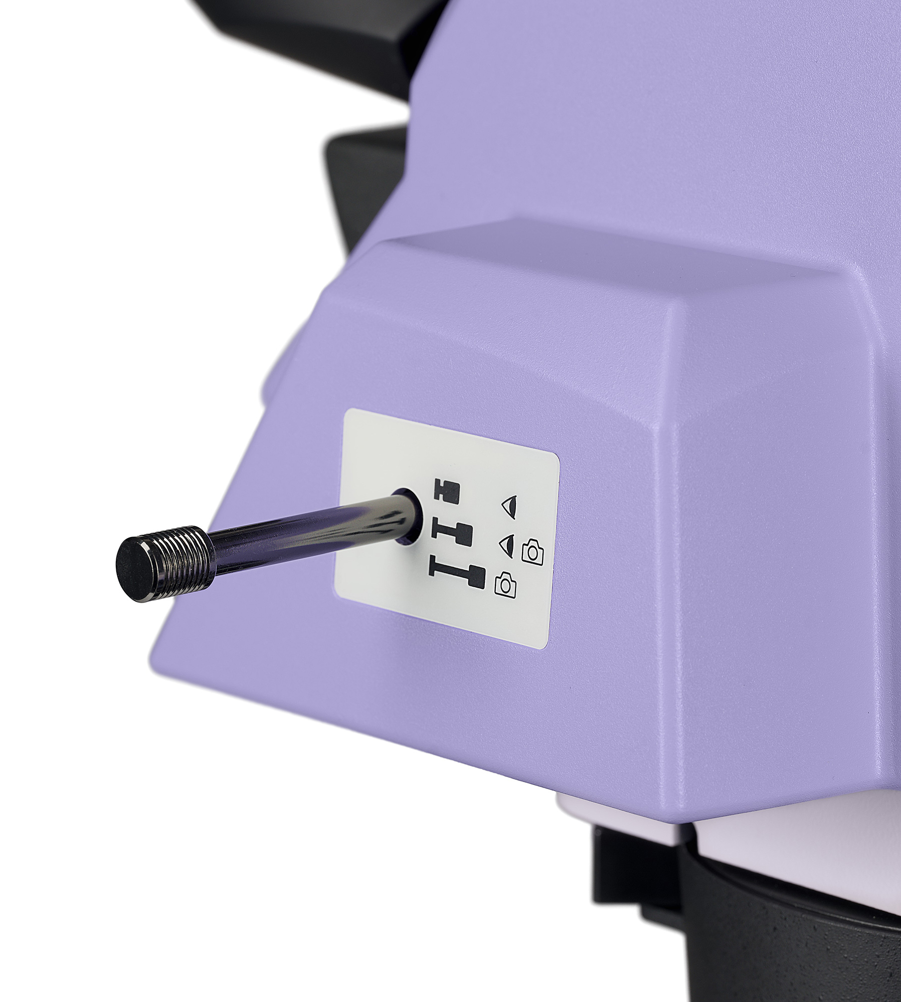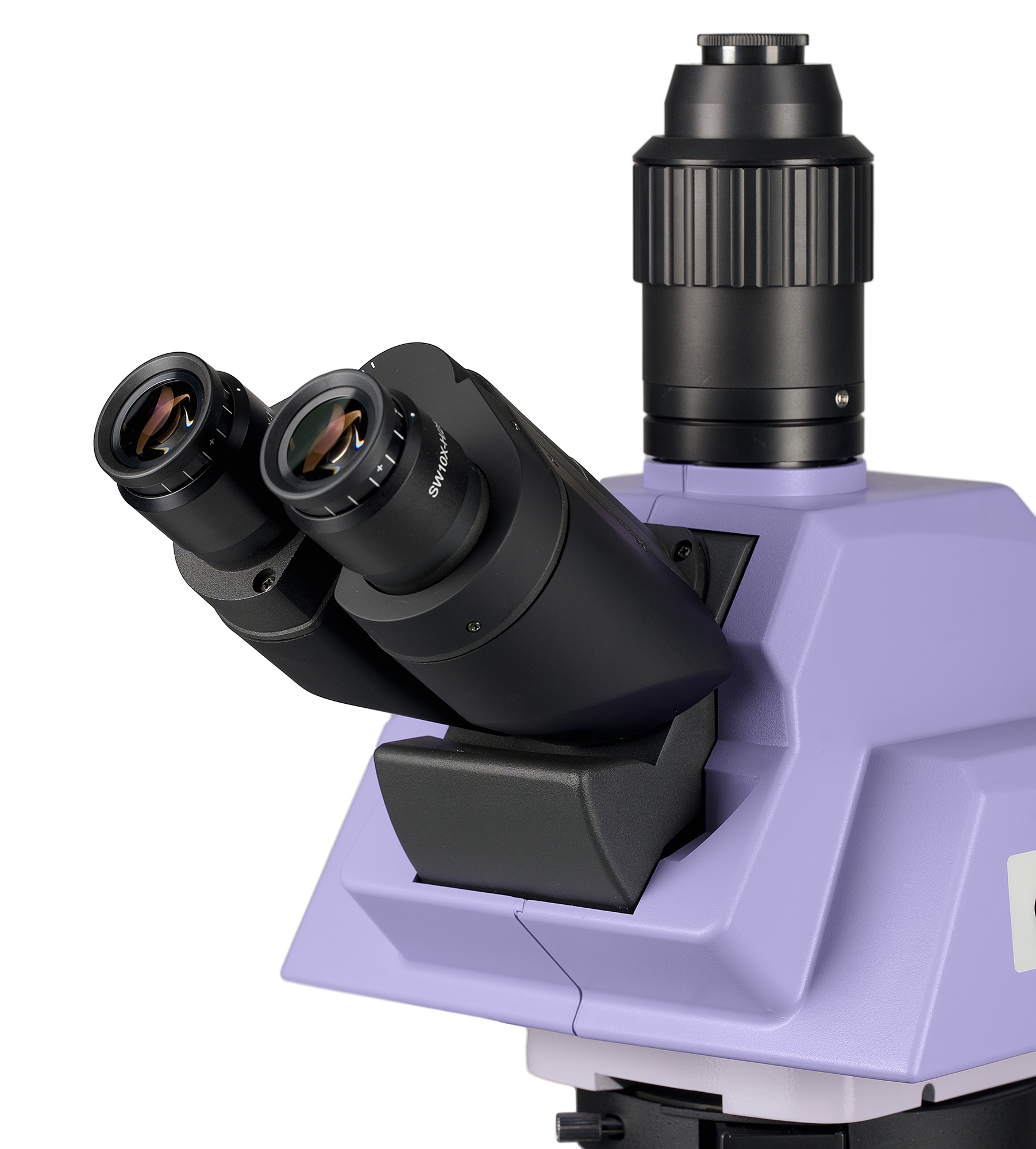 Тринокулярна глава с коригирана до безкрайност оптика. Потребителят избира най-удобния ъгъл на наклон на микроскопската глава в диапазона от 0 градуса до 35 градуса . В тринокулярната тръба е монтирана цифрова камера. Лъчът се разделя на 0/100, 100/0 или 80/20. Основният комплект включва окуляри 10x/25 mm с регулиране на диоптъра и голямо разстояние от очите за работа с очила.