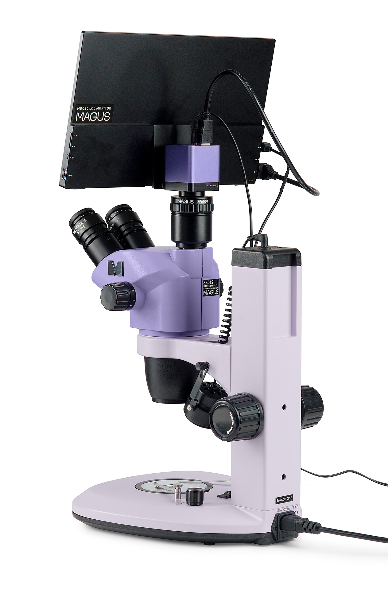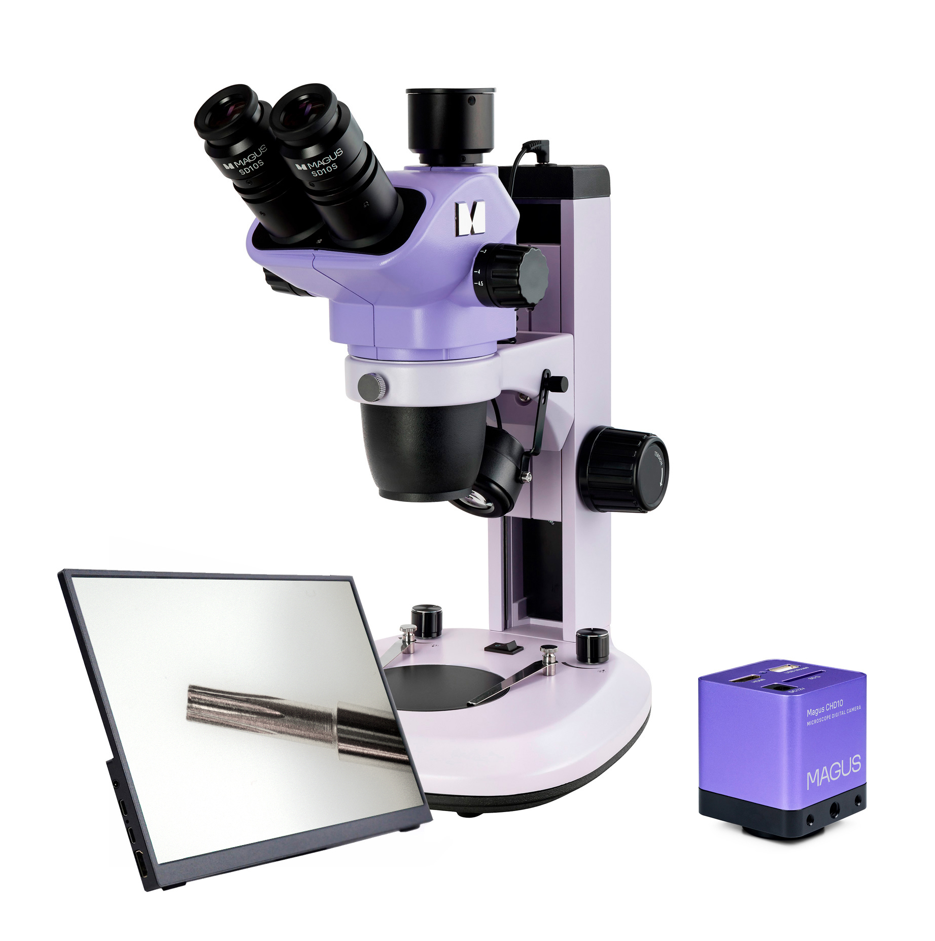 Мониторът се свързва с монтирана на микроскоп камера, за да показва изображение в реално време. Съвместим е с MAGUS HDMI камери, работещи с разделителна способност Full HD. Диагоналът на екрана е 13,3 инча. IPS сензорът осигурява ярко изображение при големи ъгли на видимост: ако погледнете към монитора по ъгъл, няма цветова аблация. Мониторът се поставя върху масата и се прикрепва към камерата. Тринокулярният микроскоп с монитор е подходящ за тези, които предпочитат да гледат напред, вместо надолу към образеца. Този метод на наблюдение е най-ергономичен, тъй като намалява натоварването на гърба и врата. Този микроскоп с монитор е подходящ и за учителите в класната стая.