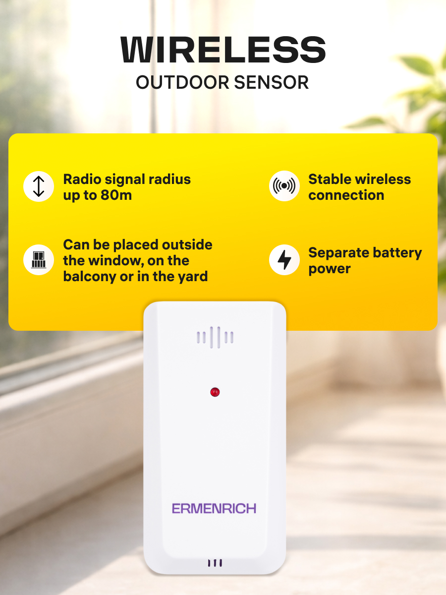 За измерване на външната влажност и температура, метеорологичната станция използва безжичен сензор с обсег на сигнала до 80 m, което означава, че потребителят може да я постави на всяко оптимално място за събиране на точни данни. Сензорът работи с две батерии тип AAA, които могат да бъдат сменени за нула време. Метеорологичната станция Ermenrich Report WR30 измерва атмосферното налягане в hPa (хектопаскали) и инчове живачен стълб, в диапазона от 850 hPa до 1050 hPa, достатъчно за употреба в повечето региони, с изключение само на районите с много голяма надморска височина. Метеорологичната станция определя също влажност на въздуха от 10% до 99%, както и температура от 0 градуса C до +50 градуса C на закрито и от ?40 градуса C до +70 градуса C на открито.