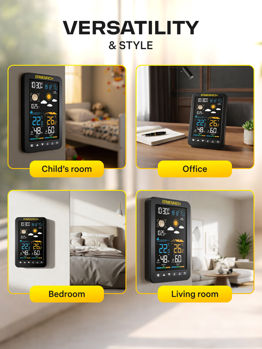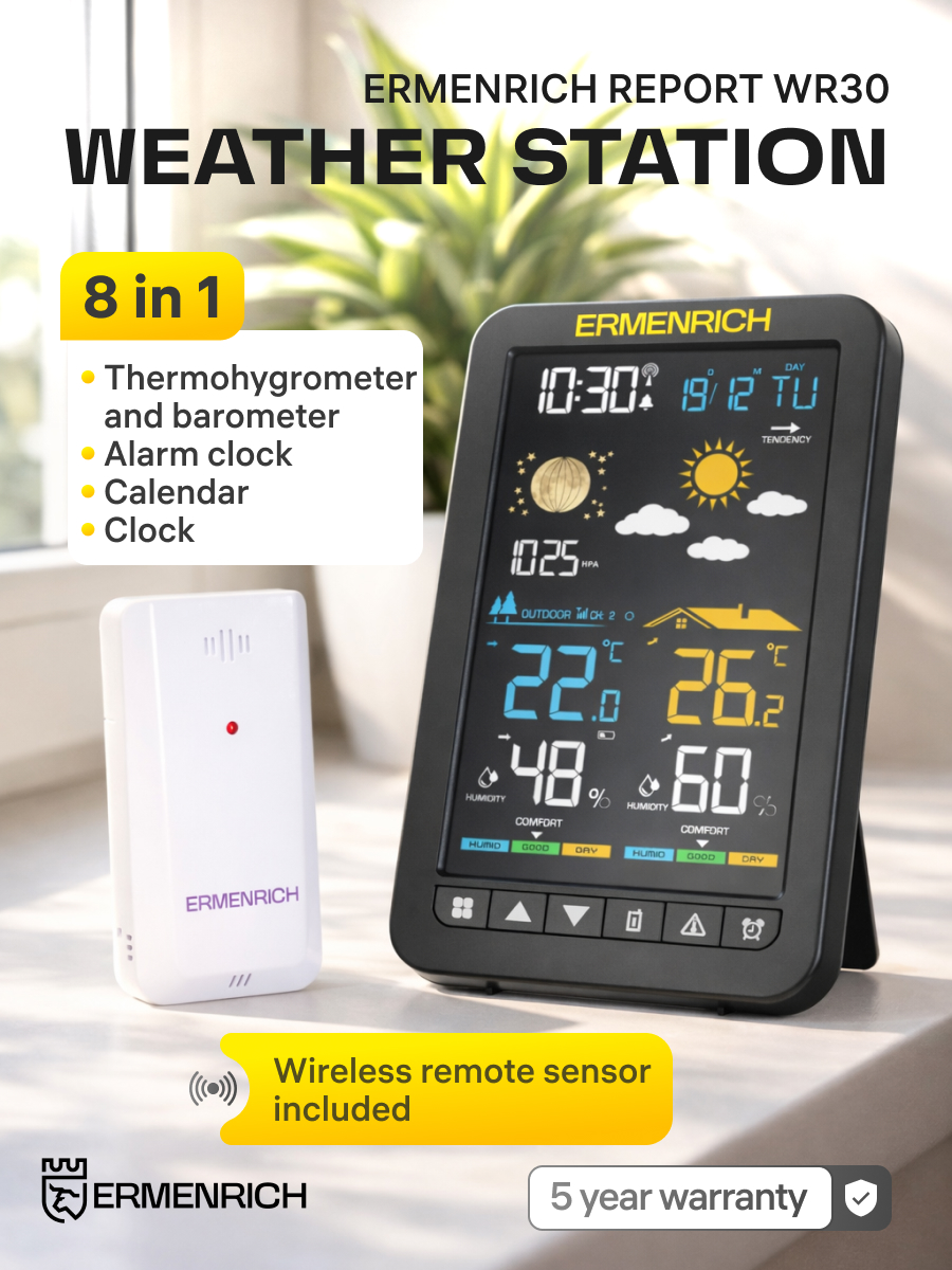 Метеорологичната станция Ermenrich Report WR30 е многофункционално домашно устройство, което е полезно както за измерване на атмосферни параметри (влажност, температура, атмосферно налягане), така и за ежедневна употреба, като осигурява бърз достъп до важна информация като час, текуща дата, прогноза за времето или фаза на луната. Големият, цветен и лесен за четене екран показва ясен текст и интуитивни икони, които дори най-младият член от семейството може да разбере. В долната част на екрана са разположени две скали за оценка на общите показатели за комфорт, изчислени въз основа на данни за вътрешните и външни условия.