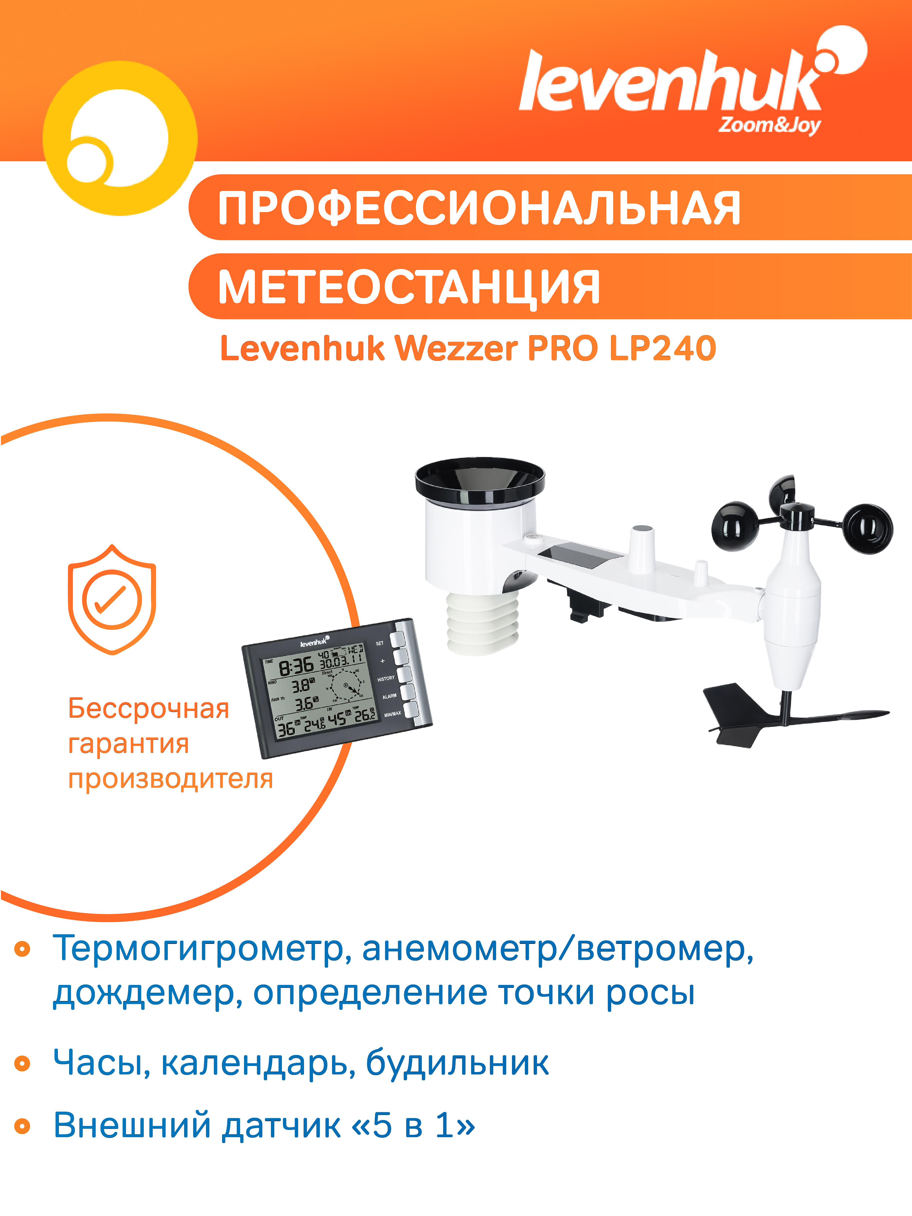 Професионалната метеорологична станция Levenhuk Wezzer PRO LP240 ще Ви предоставя подробна информация за метеорологичните условия във Вашия дом и навън. Тя заменя също часовника, календара и алармата. Станцията е оборудвана с екран с течнокристален дисплей, с подлежащо на персонализиране оформление на информацията - можете да го конфигурирате, за да виждате веднага най-важното за Вас. Натискането на произволен бутон ще включи фоновото осветление за 10 секунди.