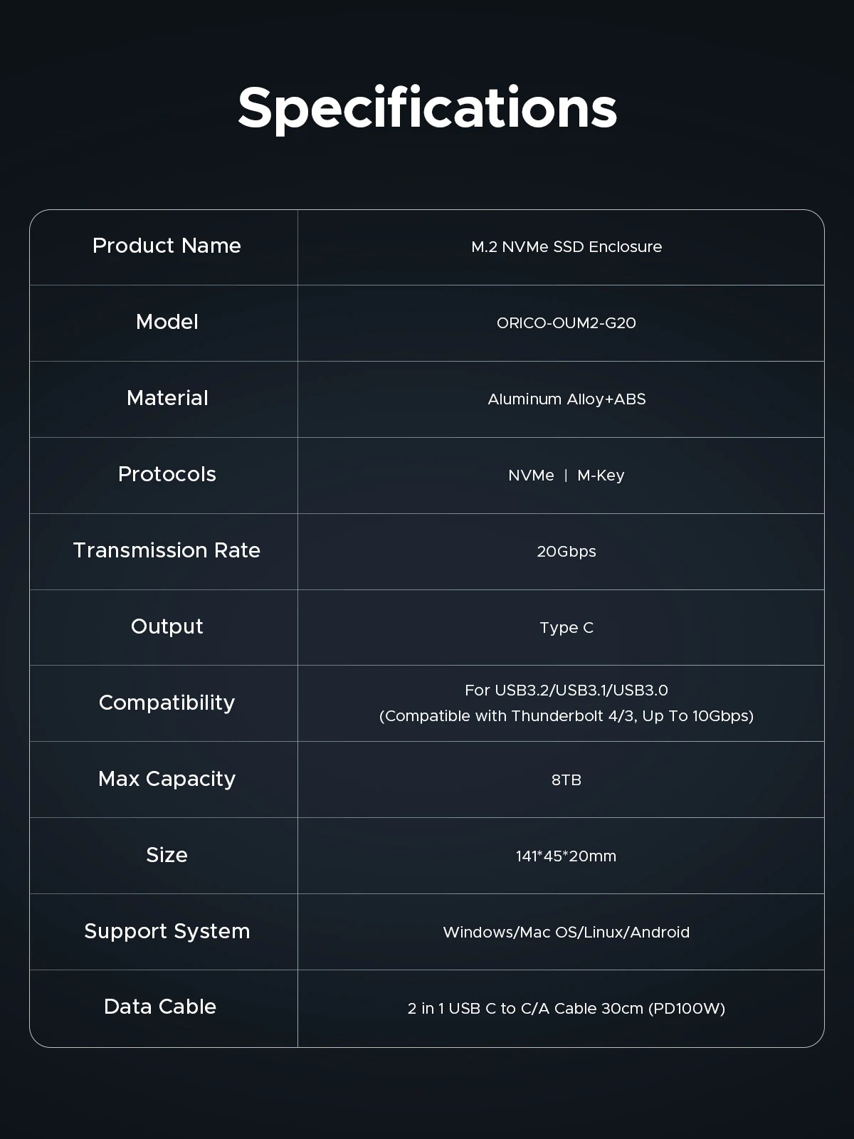 Orico Orico външна кутия за диск Storage Case M.2 NVMe M key USB3.1 Gen2 Type-C, 10Gbps HM2-G2-BK - HM2-G2-BK-BP