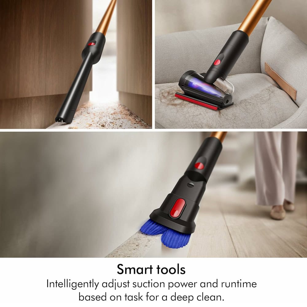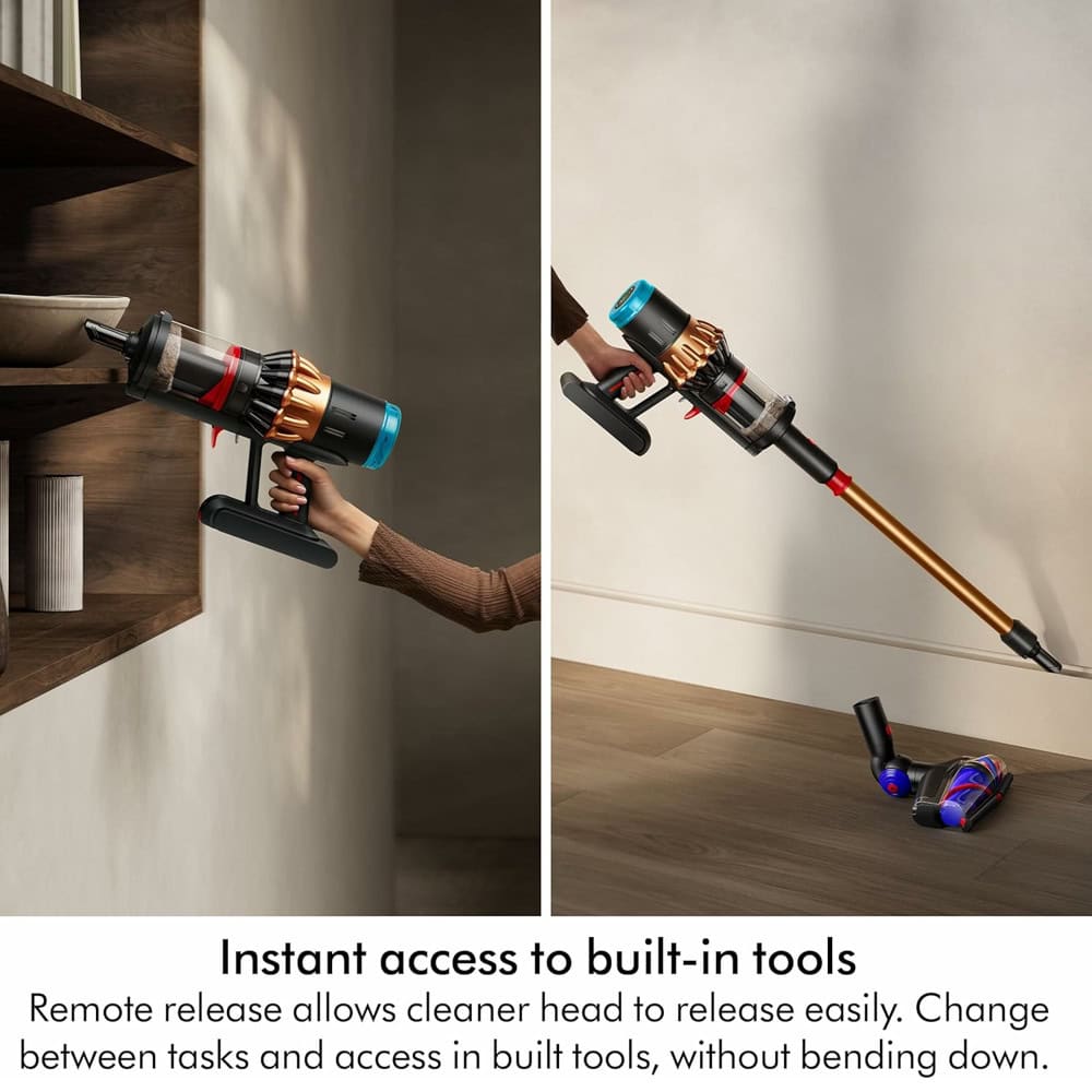Прахосмукачка Dyson V15 Detect Absolute Gold, вертикална/ръчна, безжична, 0.77 л. капацитет на контейнера, до 60 минути време на работа, HEPA филтър, циклонна технология, 3 режима, сива, 447000-01