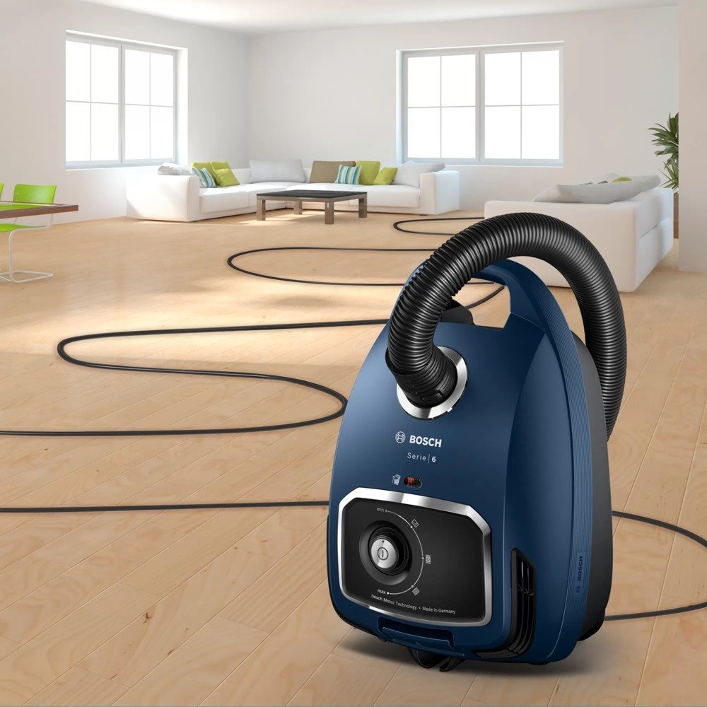 Прахосмукачка Bosch BGB6X300 Series 6, с торба, 4l. обем, 600W, PowerProtect система, HEPA филтър, синя