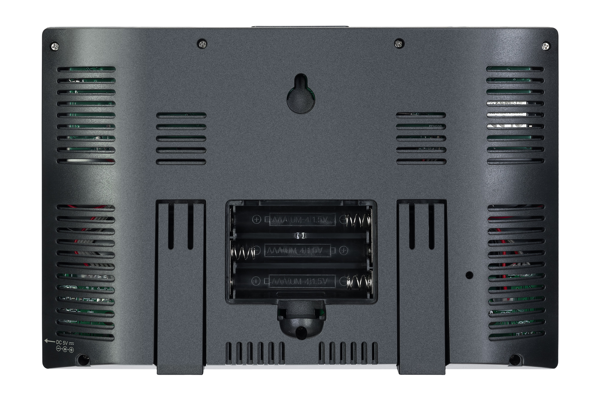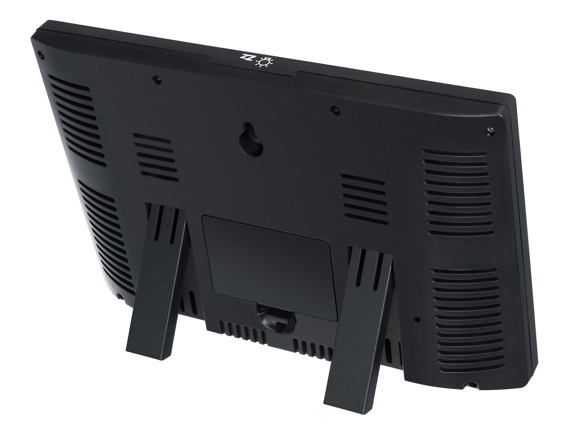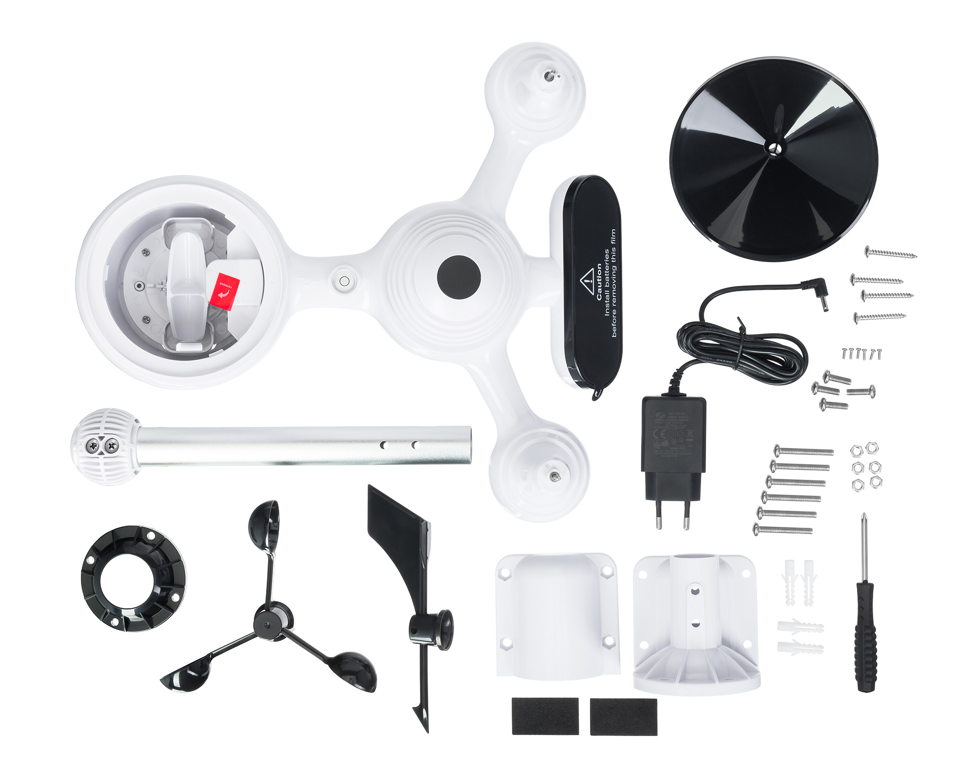Дисплеят на метеорологичната станция има светодиодно фоново осветяване за работа при слаба светлина. Дистанционният сензор се захранва от батерии АА или от вградения соларен панел. Основният модул работи с батерии AAA или променливотоково захранване. Батериите не са включени.