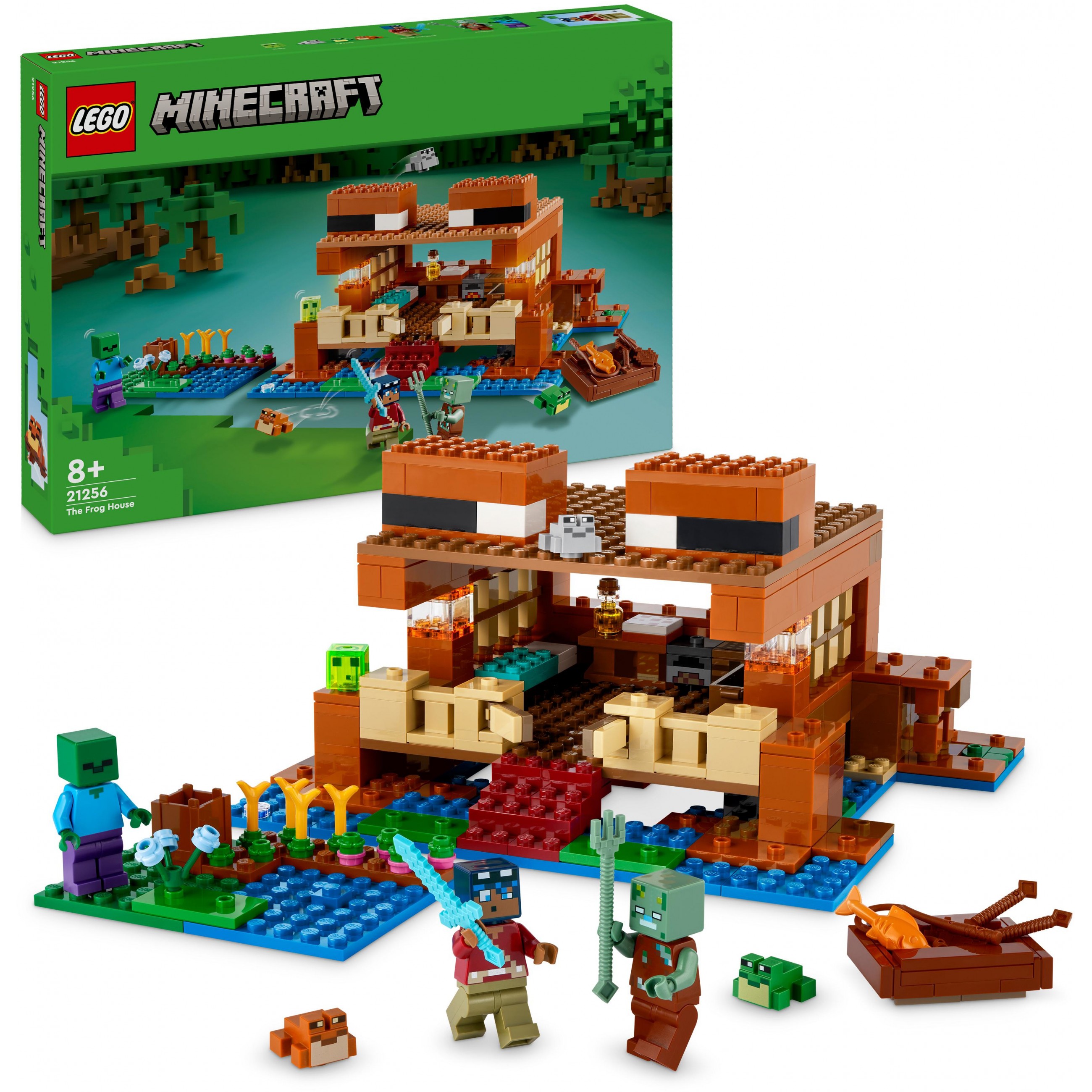 Тази LEGO къща е строителна играчка за деца, които обичат играта Minecraft и е пълна с автентични детайли от Minecraft – легло, маса, работна маса, пещ, сандък, торта и мед – и повдигащ се нагоре покрив за лесен достъп. Отвън има ферма, където играчите могат да прибират цвекло, пшеница и цветя, и езеро, където децата могат да използват въдица и тъмнодъбова лодка играчка с гребла. Има 3 типа жаби (зелена, сива и кафява) и слуз, която, както играчите знаят, има специално взаимодействие с жабите. Този многофункционален комплект LEGO Minecraft включва герой, зомби и удавник с тризъбец LEGO Minecraft фигурки, които гарантират, че строителната играчка предлага безкрайни игрови действия и забавна игра на роли. LEGO Minecraft комплектите предлагат на децата иновативен подход за изживяване на обичаната игра, превръщайки мобове, сцени и елементи в осезаеми творения с помощта на LEGO тухлички. Младите строители също ще харесат приложението LEGO Builder, което позволява на потребителите да увеличават, завъртат моделите в 3D и да проследяват напредъка.