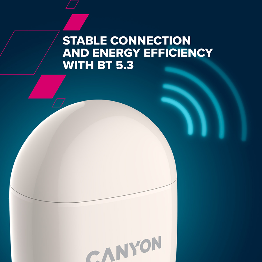 CANYON TWS-6 се свързват безжично чрез Bluetooth 5.3, което осигурява бърза и стабилна връзка. Свързването е лесно и можете да използвате слушалките с всяко Bluetooth устройство, като смартфон, таблет, лаптоп и др.