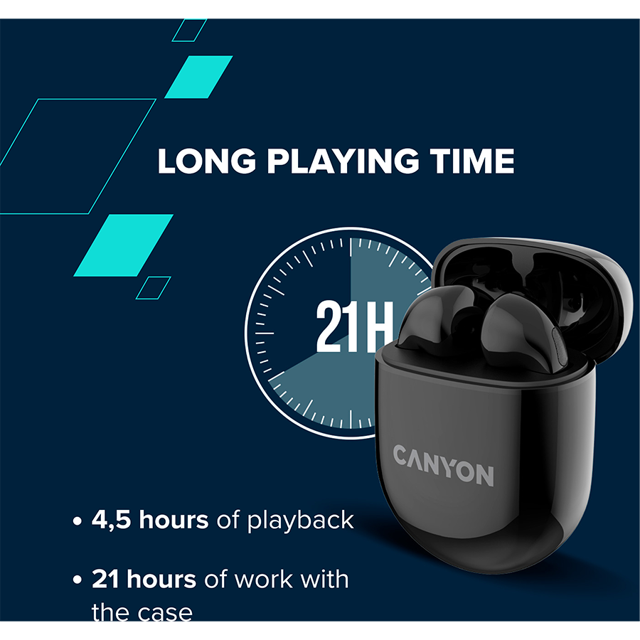 CANYON TWS-6 разполагат с дълготрайна батерия, която осигурява до 5 часа време за възпроизвеждане на музика с едно зареждане. Калъфът за зареждане удължава общото време за възпроизвеждане до 20 часа.