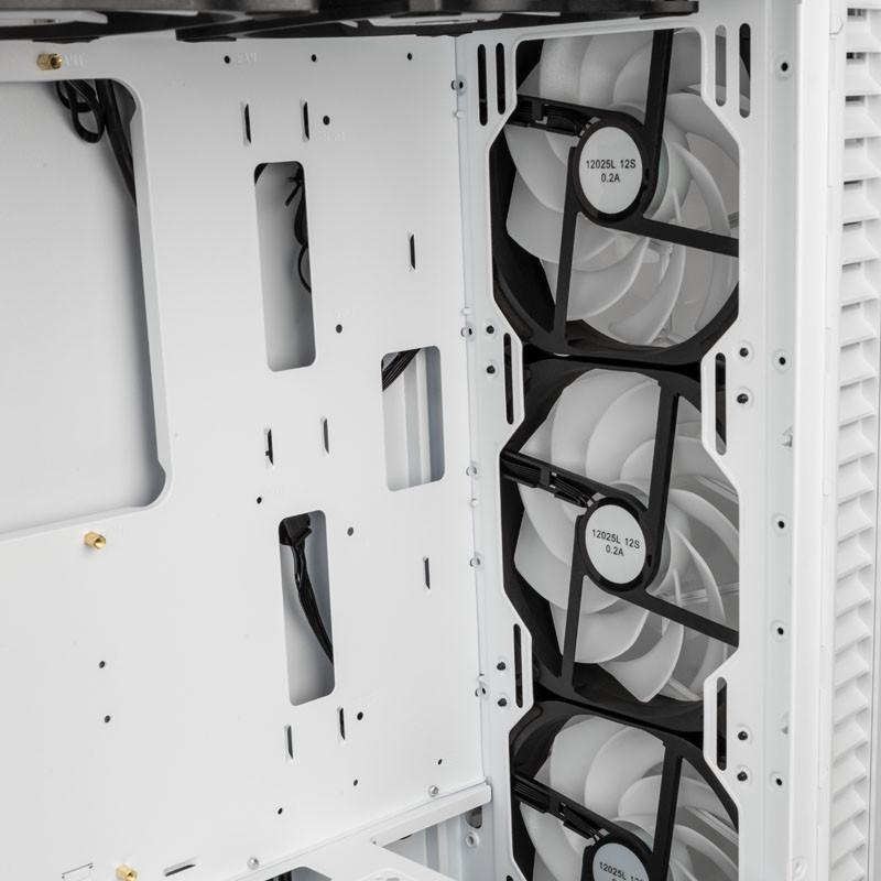 Кутията разполага с шест предварително инсталирани 120-милиметрови ARGB вентилатора, които осигуряват отличен въздушен поток, за да поддържат компонентите на компютъра ви хладни дори и при най-интензивните натоварвания. Можете също така да добавите допълнителни вентилатори или радиатори, ако е необходимо.
