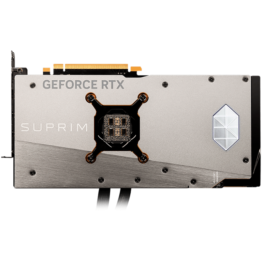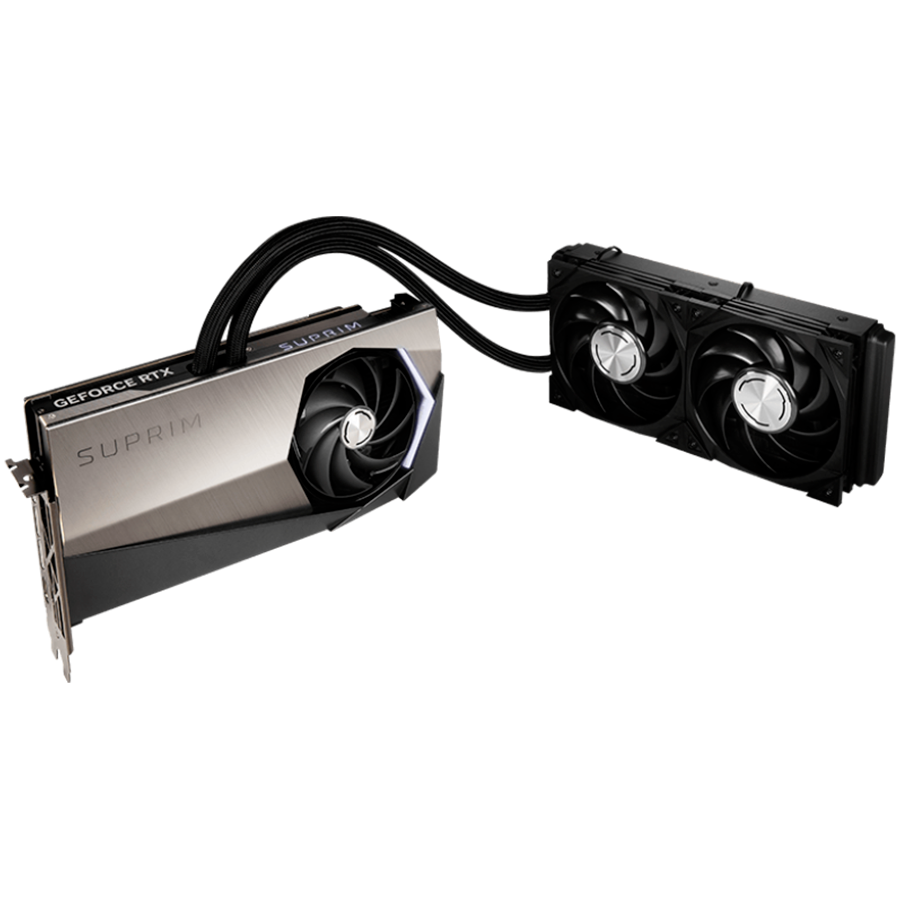 RTX 4090 SUPRIM LIQUID X 24G е оборудвана с най-модерната система за водно охлаждане, която гарантира, че картата ще работи хладно и стабилно дори при най-тежки натоварвания. Водният блок покрива изцяло графичния процесор и паметта, а трите 120-милиметрови вентилатора осигуряват оптимален въздушен поток за отвеждане на топлината.