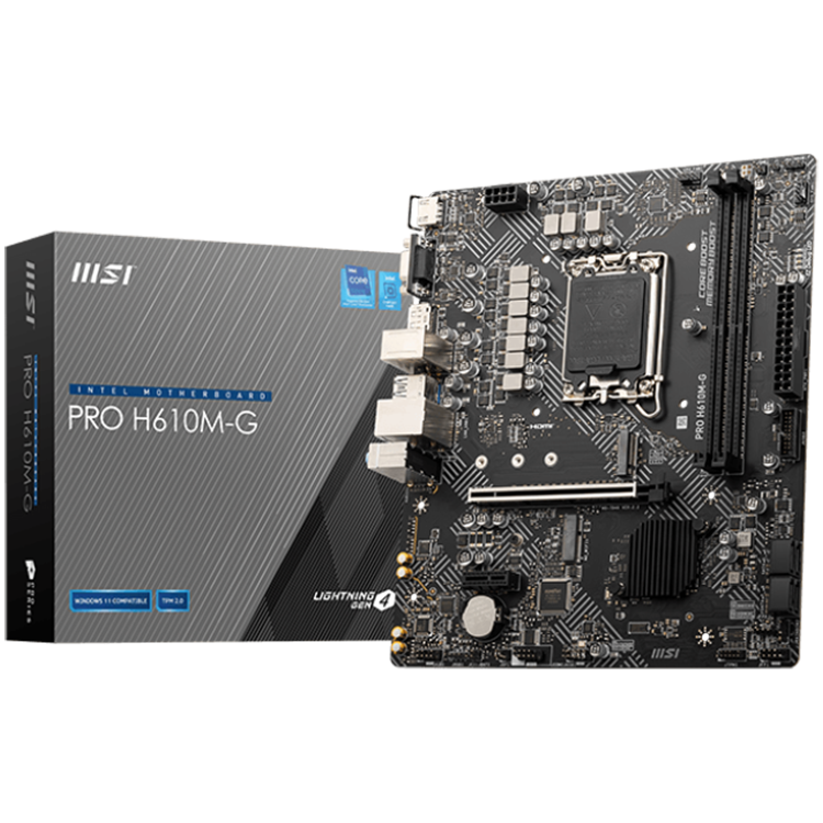MSI PRO H610M-G е компактна дънна платка, която предлага отлична производителност и функционалност за Intel процесори от 12-то и 13-то поколение. Тя е базирана на чипсета Intel H610 и поддържа до 96 GB DDR5 памет. Дънната платка има и един PCIe 4.0 x16 слот за графична карта, както и един M.2 слот за PCIe 4.0 x4 NVMe SSD.