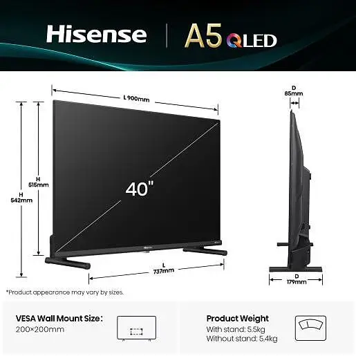 Телевизор Hisense 40A5Q, 40" (101.6cm) Full HD QLED Smart TV, HDR10, Dolby Atmos, DVB-T2/C/S2, Wi-Fi, Bluetooth, LAN, 2x HDMI, 1x USB
